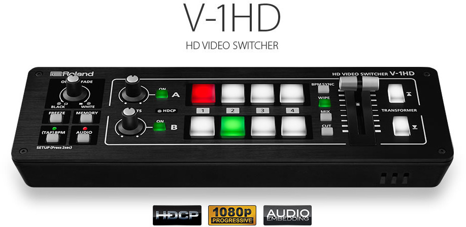 Roland V-1HD -videomikserillä vaihdat helposti neljän eri HDMI-lähteen välillä joko nappien tai liukukytkimien avulla. Tukee monia kompositointiefektejä.