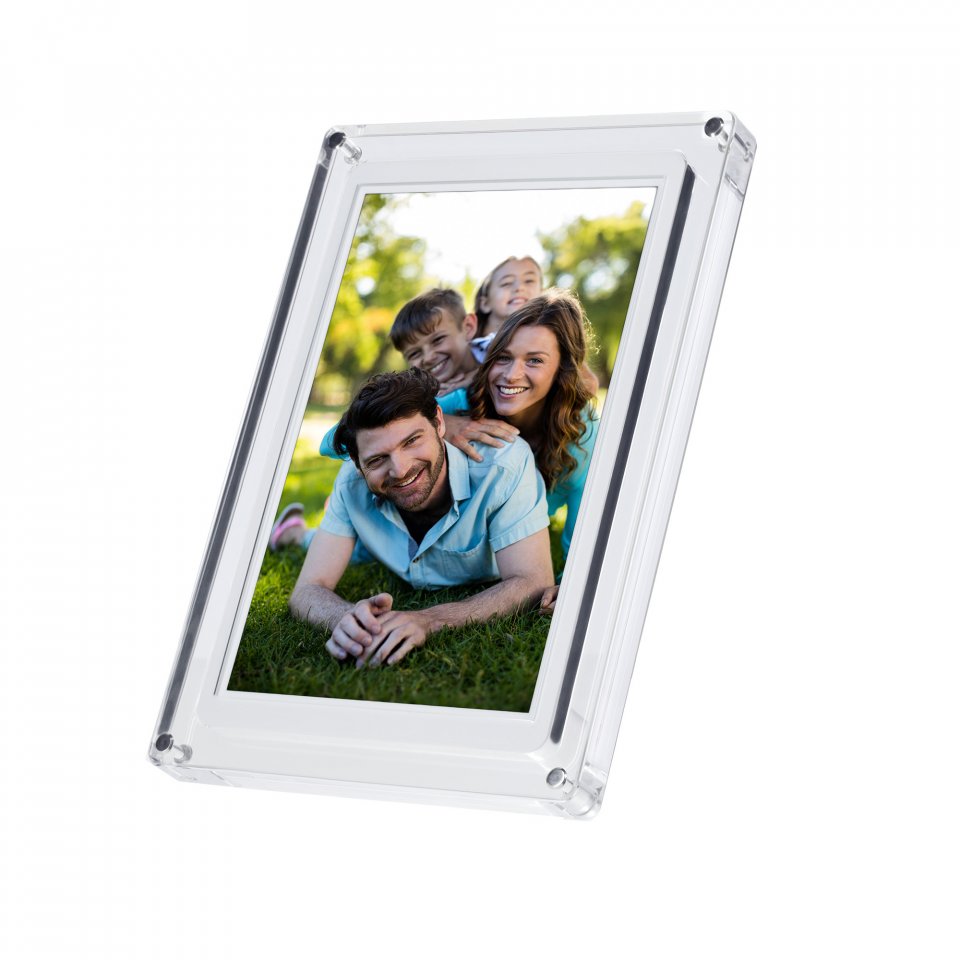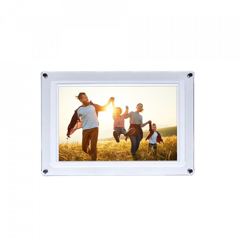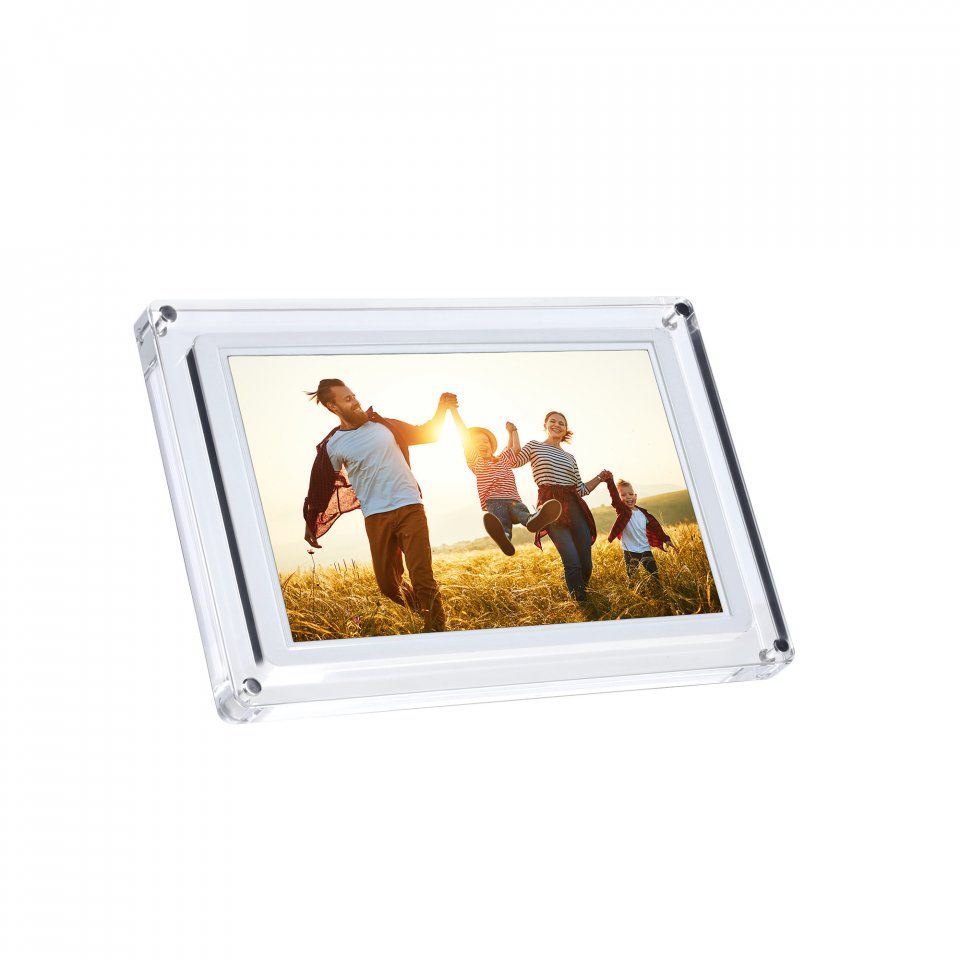 Kehyksen läpinäkyvä akryylirunko antaa sille modernin ja kevyen ulkonäön, joka sopii monenlaisiin sisustustyyleihin. Laite painaa 960 grammaa ja sen mitat ovat 28,3 x 19,2 x 2,6 cm. Kehyksen voi asettaa sekä vaakaan että pystyyn, ja mukana tulee tukeva jalusta. Virransyöttö tapahtuu USB-C-liitännän kautta, ja mukana toimitetaan virtalähde sekä USB-C-kaapeli.