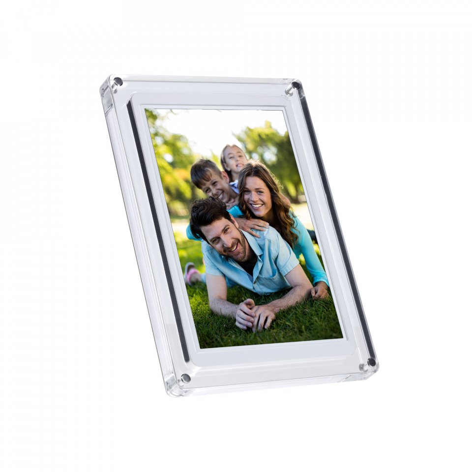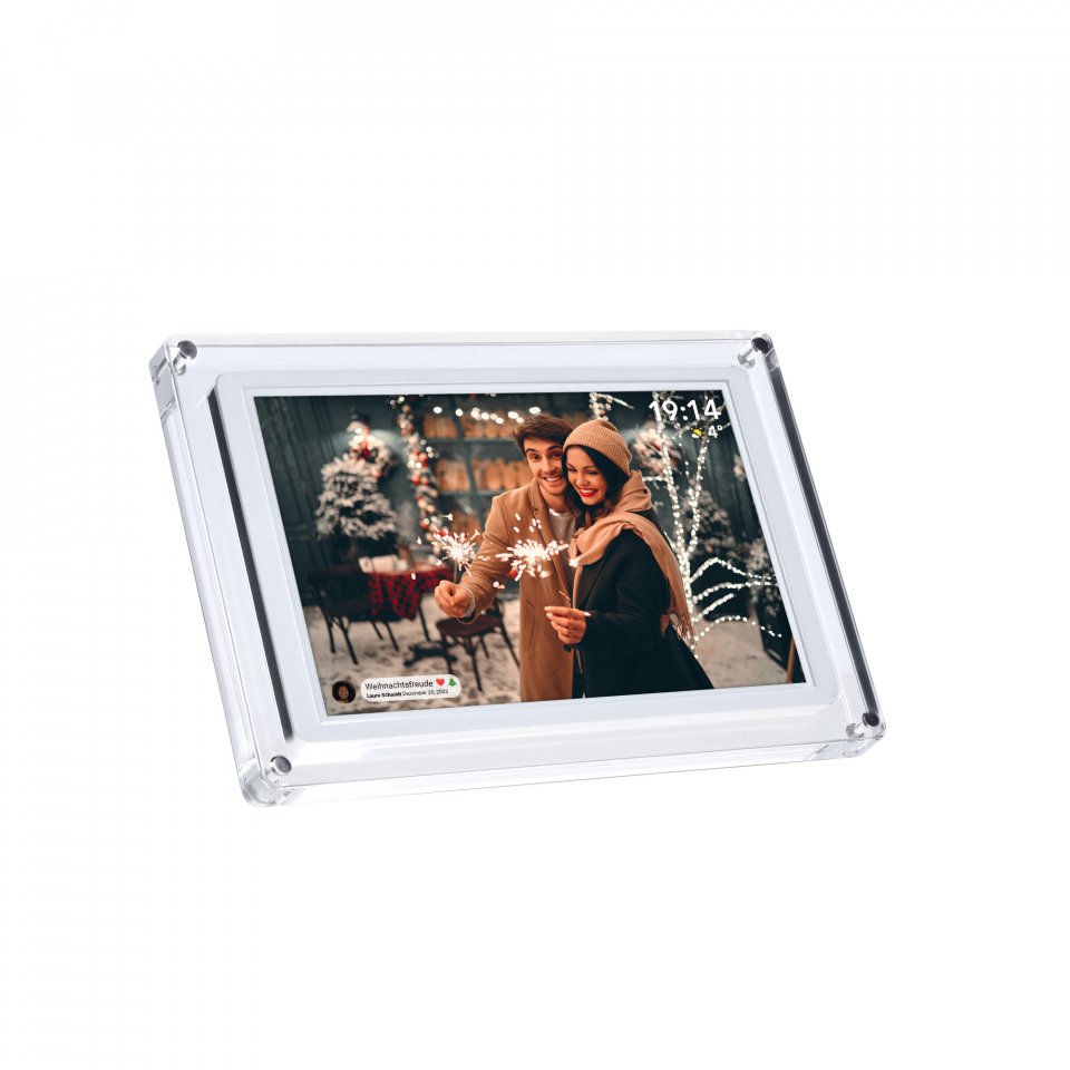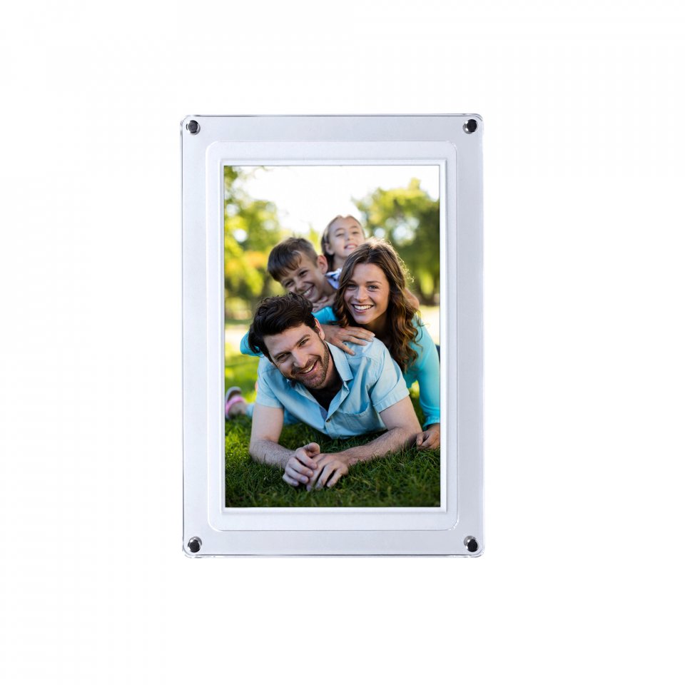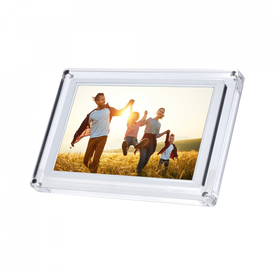 Kehyksen läpinäkyvä akryylirunko antaa sille modernin ja kevyen ulkonäön, joka sopii monenlaisiin sisustustyyleihin. Laite painaa 960 grammaa ja sen mitat ovat 28,3 x 19,2 x 2,6 cm. Kehyksen voi asettaa sekä vaakaan että pystyyn, ja mukana tulee tukeva jalusta. Virransyöttö tapahtuu USB-C-liitännän kautta, ja mukana toimitetaan virtalähde sekä USB-C-kaapeli.
