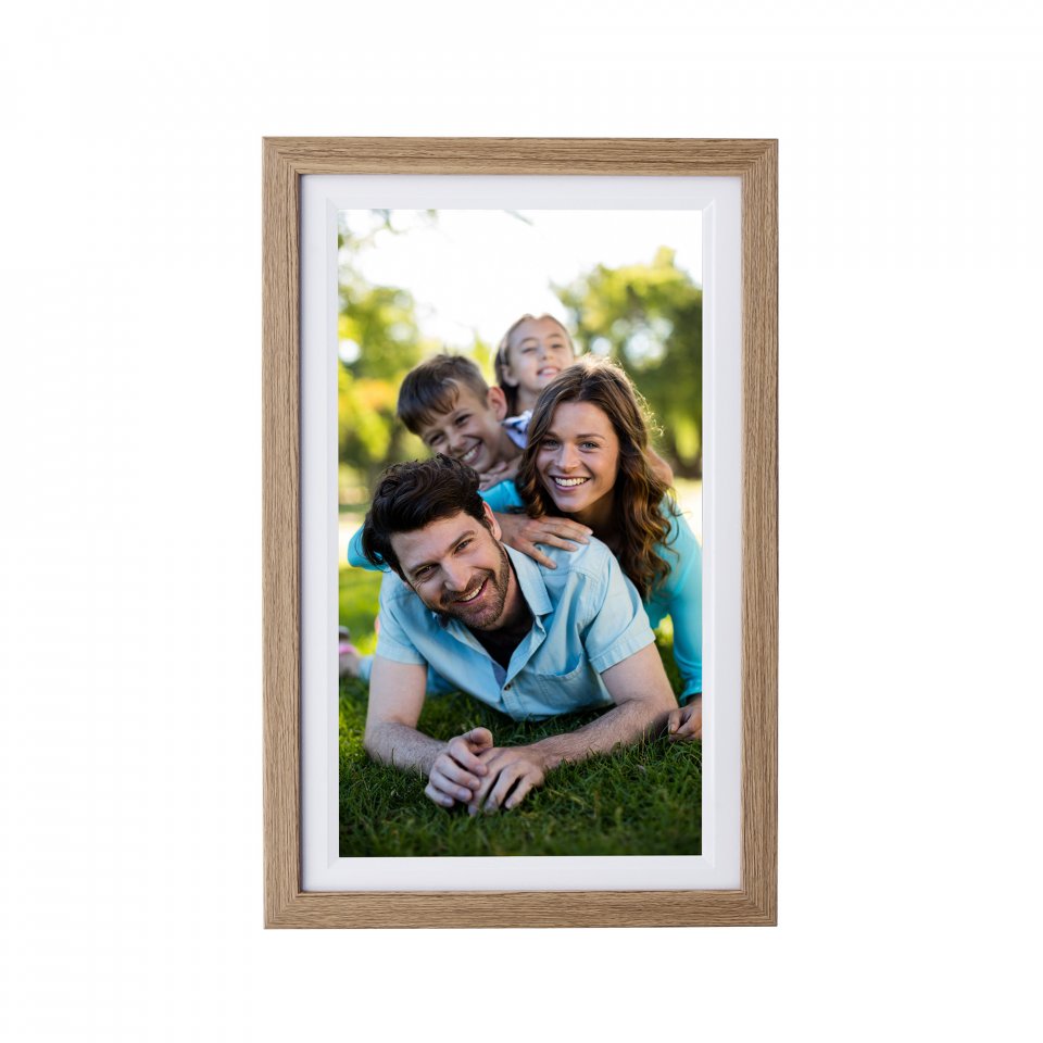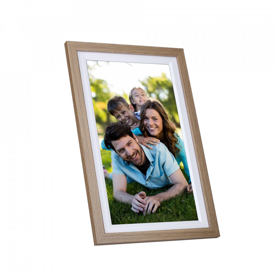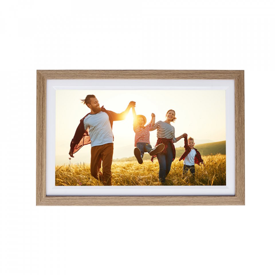 Valokuvakehys on valmistettu tammenvärisestä puusta, joka antaa sille klassisen ja esteettisen ilmeen. Valkoinen passe-partout kehystää kuvat kauniisti ja tekee kokonaisuudesta näyttävän. Laitteen mitat ovat 41,9 x 27,4 x 3,4 cm ja paino 1,32 kg, joten se on kevyt ja helppo sijoittaa eri paikkoihin.