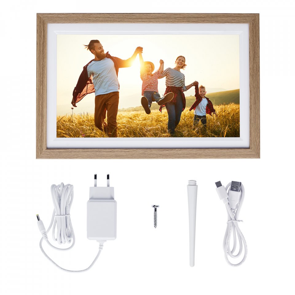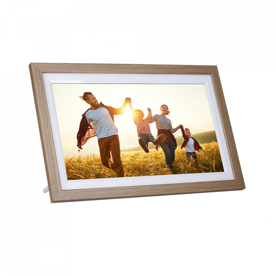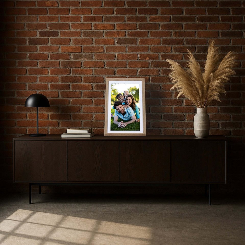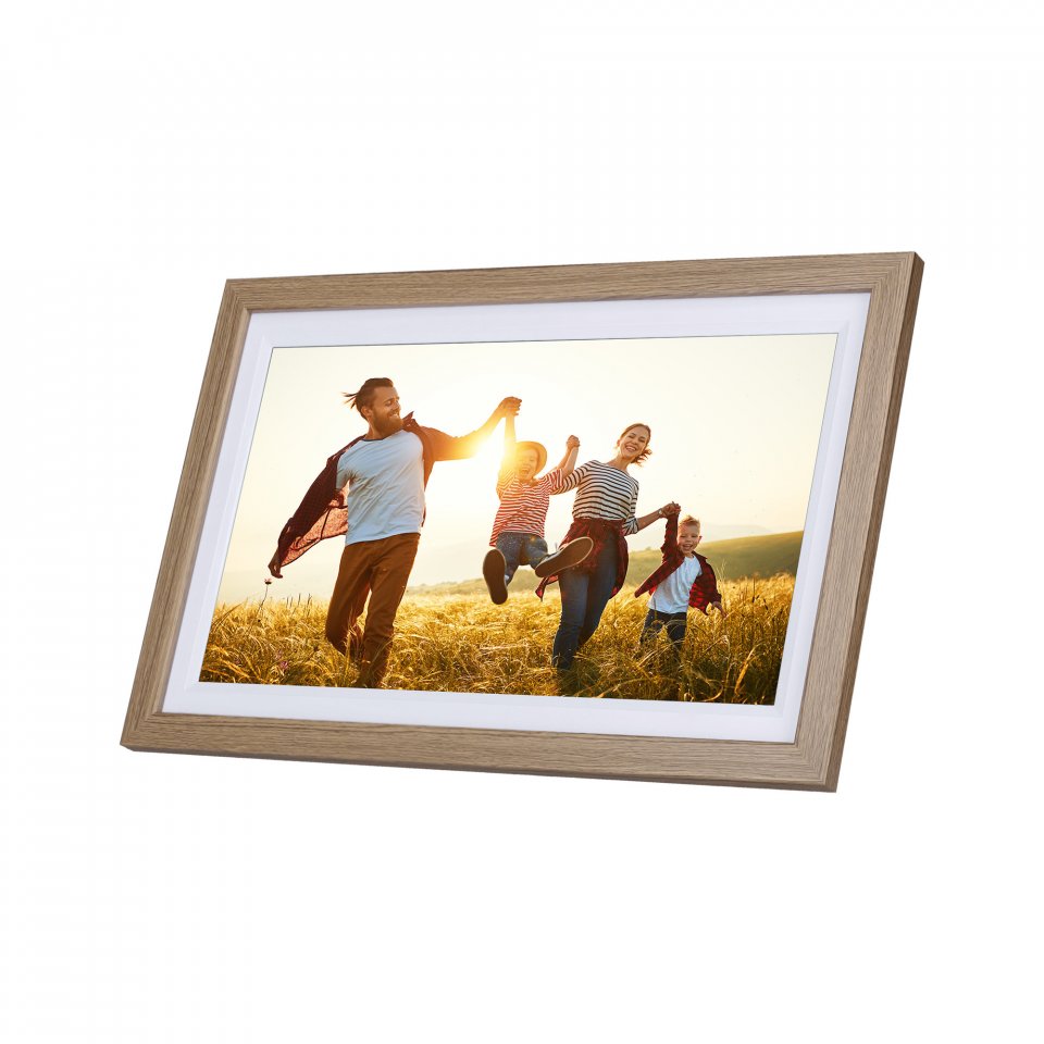 Valokuvakehys on valmistettu tammenvärisestä puusta, joka antaa sille klassisen ja esteettisen ilmeen. Valkoinen passe-partout kehystää kuvat kauniisti ja tekee kokonaisuudesta näyttävän. Laitteen mitat ovat 41,9 x 27,4 x 3,4 cm ja paino 1,32 kg, joten se on kevyt ja helppo sijoittaa eri paikkoihin.