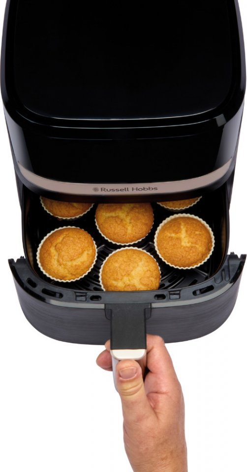 Russell Hobbs Satisfry Air 4,3 L on kompakti kuumakiertoilmakypsennin, joka tarjoaa tilavan paistokorin ja monipuoliset toiminnot arjen ruoanlaittoon. Sen avulla valmistat ruokia vähemmällä öljyllä ja nopeammin kuin perinteisellä uunilla. Laite sopii hyvin perheen aterioiden valmistukseen tai pienten annosten lämmittämiseen. Moderni musta design ja samppanjansävyiset yksityiskohdat tekevät siitä tyylikkään lisän keittiöön.