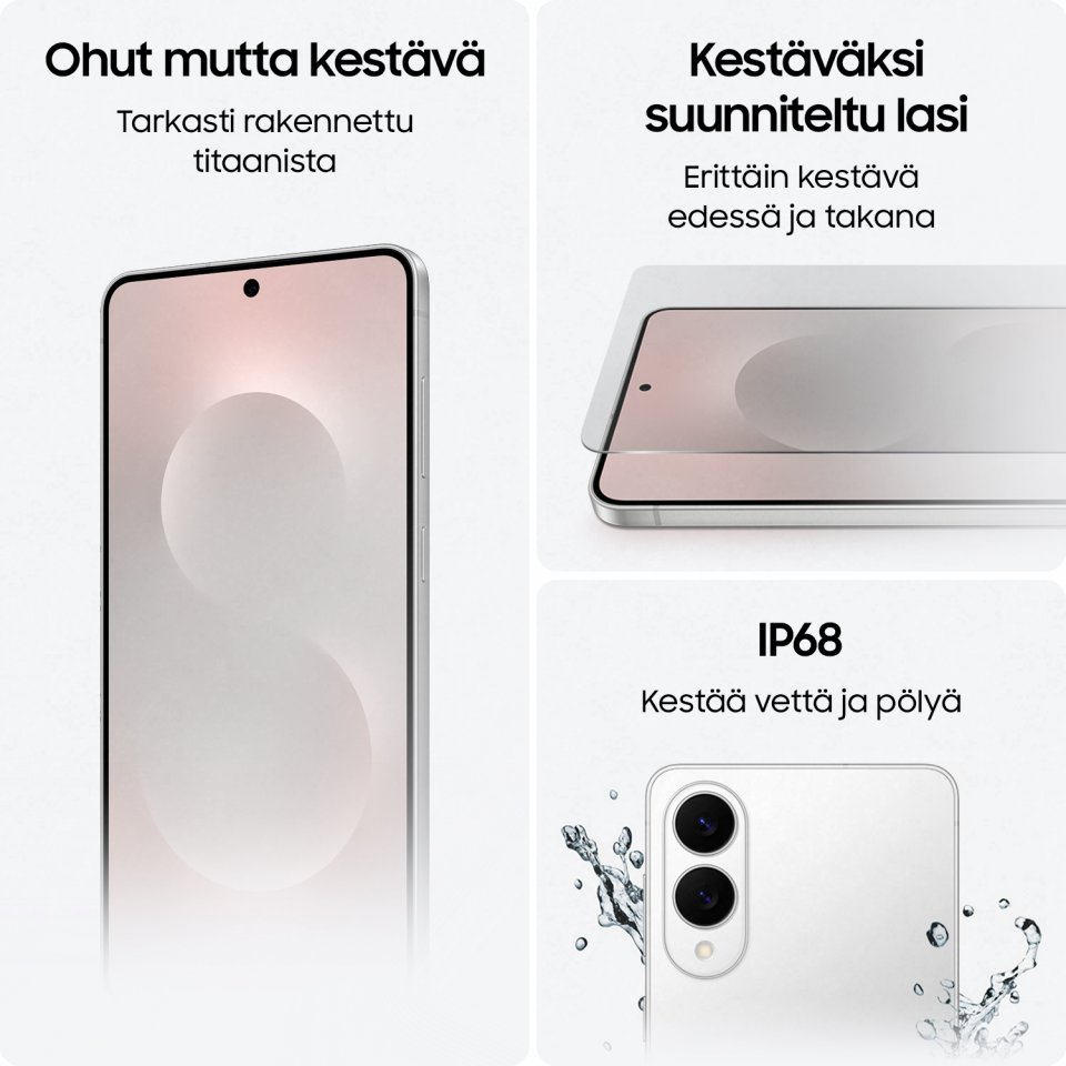 Samsung Galaxy S25 Edge on suunniteltu olemaan sekä tyylikäs että kestävä. Sen ohut ja kevyt muotoilu tekee siitä helposti mukana kuljetettavan, kun taas titaanirunko ja Gorilla® Glass -lasitus suojaavat puhelinta päivittäiseltä kulutukselta. IP68-luokitus tarkoittaa, että voit ottaa puhelimen mukaasi jopa sateiseen säähän ilman huolta. Tämä puhelin on rakennettu kestämään elämän haasteet.