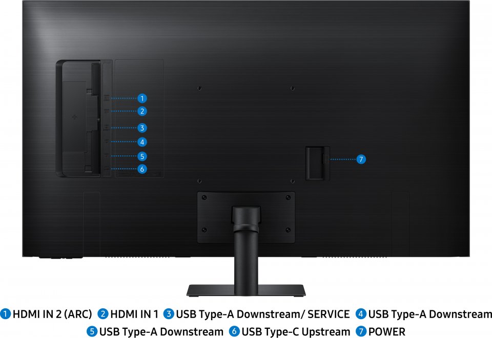 Samsung Smart Monitor M7 sisältää kaksi 20 W kaiutinta, jotka tuovat äänen helposti mukaan ilman erillistä kaiutinta. Liitäntöihin kuuluvat kaksi HDMI 2.0 -porttia, USB-C (65 W Power Delivery), kolme USB 2.0 -porttia, WiFi ja Bluetooth 5.2. Näytön kallistusta voi säätää +20°:sta -2°:iin, mikä auttaa löytämään juuri oikean katselukulman. Se on myös VESA-yhteensopiva 200 x 200 mm ja helppo kiinnittää seinälle.