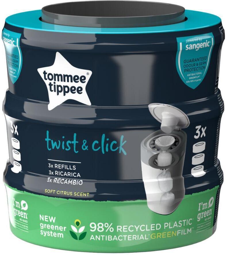 Antibakteerinen ja tuokstut lukitseva Sangenic Twist&Click -vaihtokasetti on valmistettu lähes kokonaan kierrätysmuovista. Monikerroksinen Greenfilm-kalvo tappaa 99% bakteereista, mukaan lukien E.Coli. Kasetin hento sitruksen tuoksu tekee vaipparoskiksen käytöstä mahdollisimman miellyttävän.