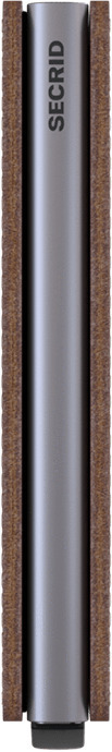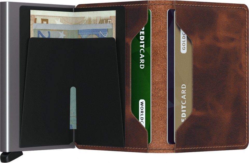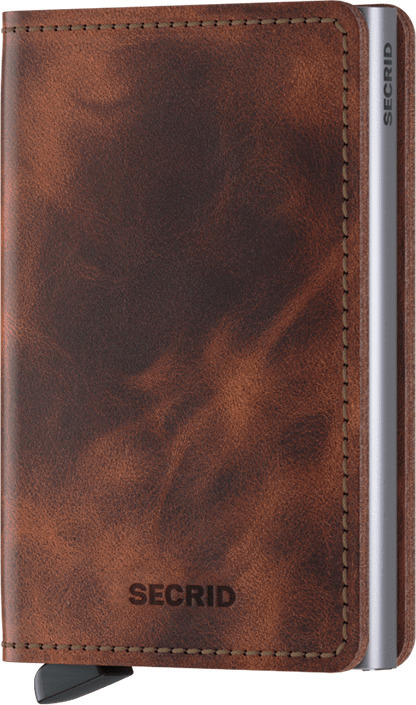 Secrid Slimwallet on kevyt ja ohut lompakon ja Secrid Cardprotector -korttikotelon yhdistelmä. Sen ohuen nahkaläpän taskuun mahtuu kaksi korttia tai käteistä rahaa. Lompakko-osuus on valmistettu laadukkaasta eurooppalaisesta nahasta, ja korttikotelo on kestävää alumiinia. Vintage-nahkatyypissä on huolella hiottu pinta ja vahaviimeistely, mikä saa nahan näyttämään kivipestyltä. Vahan ansiosta nahka on herkempi naarmuille, mikä muokkaa nahan ulkonäköä ajan kuluessa persoonallisemmaksi.