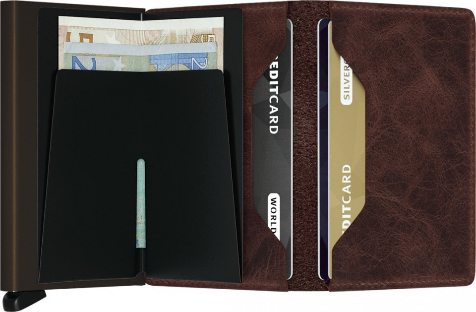 Secrid Slimwallet on kevyt ja ohut lompakon ja Secrid Cardprotector -korttikotelon yhdistelmä. Sen ohuen nahkaläpän taskuun mahtuu kaksi korttia tai käteistä rahaa. Lompakko-osuus on valmistettu laadukkaasta eurooppalaisesta nahasta, ja korttikotelo on kestävää alumiinia. Vintage-nahkatyypissä on huolella hiottu pinta ja vahaviimeistely, mikä saa nahan näyttämään kivipestyltä. Vahan ansiosta nahka on herkempi naarmuille, mikä muokkaa nahan ulkonäköä ajan kuluessa persoonallisemmaksi.
