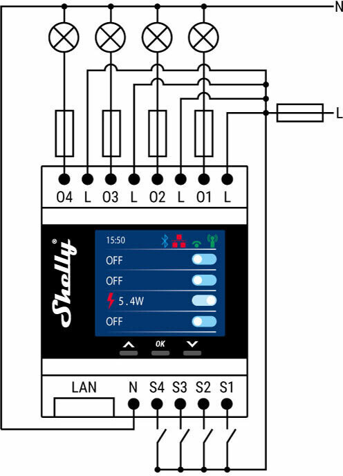 Shelly Pro 4PM -DIN-kiskorele, 1-vaiheinen
