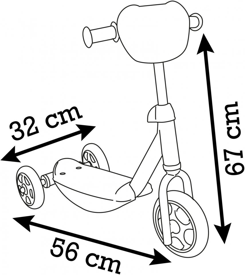 Kolmipyöräinen Smoby-potkulauta on koristeltu hienolla Gabbyn Nukkekoti -aiheisella kuvioinnilla, joka ilahduttaa pientä potkuttelijaa. Ohjaustangon korkeus on säädettävissä mukavan ajokokemuksen takaamiseksi. Metallirunko lisää vakautta ajon aikana, ja hiljaiset, läpinäkyvät pyörät varmistavat pehmeän ja tasaisen menon. Leveä astinlauta ja liukumaton jalkatuki tarjoavat hyvän pidon, kun taas pehmustetut kahvat tekevät ohjaamisesta miellyttävää.