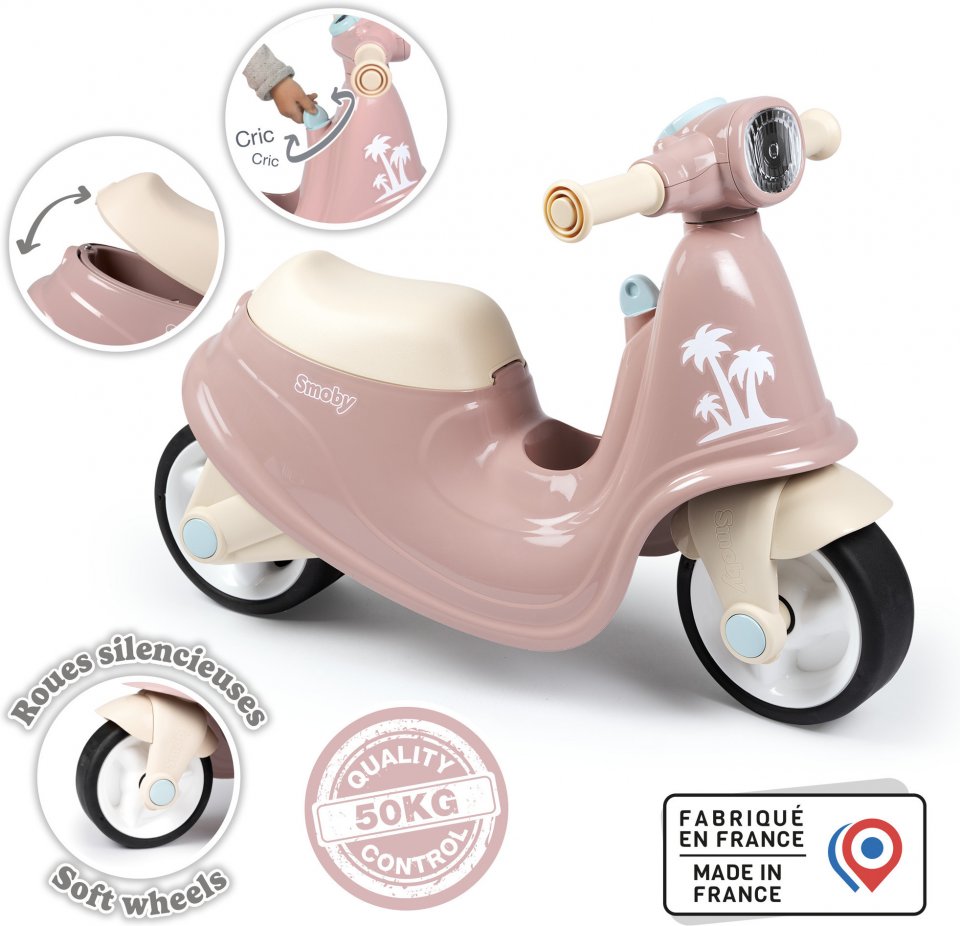 Ranskassa valmistettu päältä ajettava Smoby-skootteri kehittää taaperon tasapainoa, koordinaatiota ja motorisia taitoja hauskalla tavalla. Istuinkorkeus on 30 cm, joten pikkuinen voi potkutella seikkailuihin jo 18 kuukauden ikäisestä alkaen! Skootteri on muotoilultaan aidon esikuvansa kaltainen, ja siinä on mekaaninen avain ja muoviset ajovalot, joten ajokokemus on taattu. Istuimen alla olevassa säilytystilassa voi säilyttää ajon aikana vaikkapa lempilelua. Hiljaisten pyörien ansiosta skootterilla ajo ei häiritse melulla isojen eikä pienten korvia!