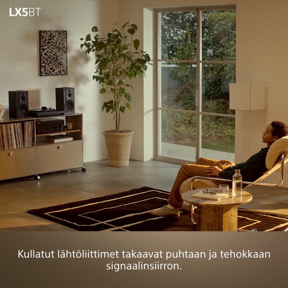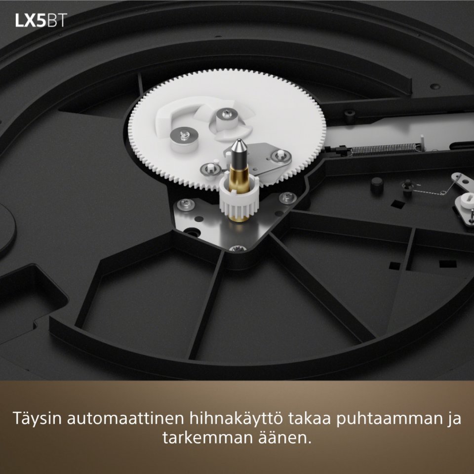 Bluetooth-yhteys Hi-Res Wireless Audio-, Qualcomm aptX- ja aptX Adaptive -tuella mahdollistaa korkealaatuisen toiston langattomilla kuulokkeilla tai kaiuttimilla. Säädettävä vahvistuskytkin (LOW, MID, HIGH) antaa mahdollisuuden hienosäätää äänen lähtötasoa jokaisen levyn ja henkilökohtaisten mieltymysten mukaan. Sisäänrakennetun phono-etuasteen ansiosta levysoittimen voi helposti liittää suoraan aktiivikaiuttimiin tai hifi-järjestelmään. Minimalistisesti muotoiltu ja läpinäkyvällä pölykannella varustettu levysoitin sopii kauniisti tilaan kuin tilaan.