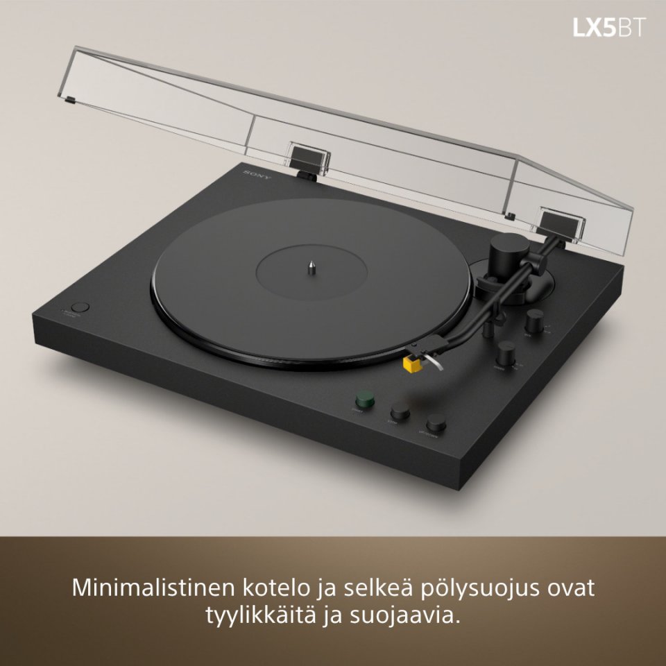 Rakennettu yksityiskohtaiseksi. Muotoiltu yksinkertaiseksi. Sony PS-LX5BT on premium-levysoitin, joka tarjoaa audiofiilitasoisen vinyylikokemuksen vaivattomasti. Se on suunniteltu musiikin harrastajille, jotka arvostavat sekä äänenlaatua että tyyliä. Täysin automaattinen hihnamekanismi tekee kuuntelun aloittamisesta helppoa – paina vain play ja nauti musiikista. Soitin tukee sekä 33 1/3 että 45 RPM -nopeuksia koko vinyylikokoelman optimaaliseen toistoon.