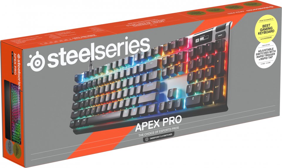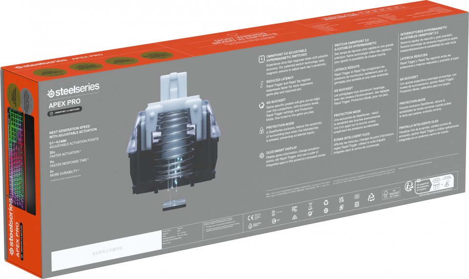 Näppäimistöjen nopein parani juuri entisestään! Ota etulyöntiasema pelaamiseen SteelSeries Apex Pro Gen 3 -pelinäppäimistöllä, joka hyödyntää huippunopeaa Hall Effect -magneettikytkinteknologiaa. Säädettävät OmniPoint 3.0 HyperMagnetic -kytkimet mullistavat pelikokemuksesi. Voit muuttaa aktivointialuetta 0,1 mm:stä 4,0 mm:iin ja mukauttaa toiminnan täydelliseksi niin nopeatempoiseen pelaamiseen kuin tarkkuutta vaativaan kirjoittamiseen.