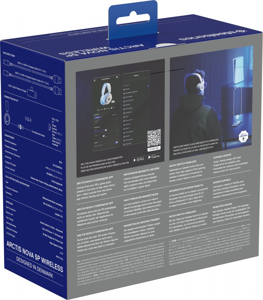 Arctis Nova 5P -pelikuulokkeet tarjoavat huipputason äänentoiston kaikille suosikkipeleillesi: mukana tulee yli 100 EQ-presettiä PS5:lle Companion-sovelluksen kautta. Pelisuunnittelijoiden ja e-urheiluammattilaisten kanssa yhteistyössä räätälöidyt taajuuskorjainasetuksiet lukuisille peleille (esim. Fortnite, Apex Legends, Minecraft) korostavat askelia ja muita tärkeitä yksityiskohtia pelin äänentoistossa tarjoten etulyöntiaseman toimintaan ja mukaansatempaavamman pelielämyksen. Hervoton 60 tunnin akunkesto, 2,4 GHz:n langaton yhteys + Bluetooth sekä USB-C-dongle takaavat pitkät pelisessarit niin PC:llä, PlayStationilla, Switchillä kuin mobiililaitteilla. Nopea USB-C-lataus takaa, että kuulokkeet ovat aina valmiina seuraavaan peliin.
