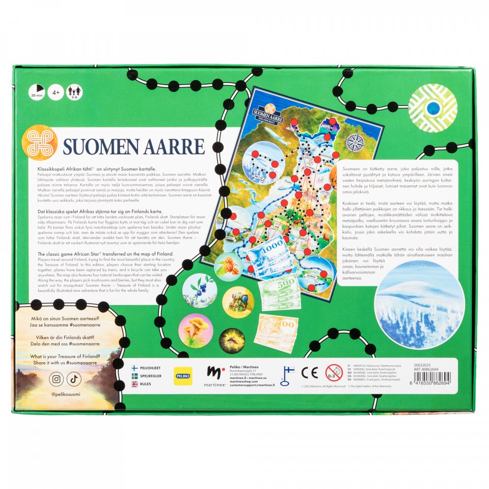 Kartalla on myös neljä kansallismaisemaa, joissa pelaajat voivat vierailla. Matkan rahoittamiseksi pelaajat poimivat sieniä ja marjoja. Suomen Aarre on hauska uusi seikkailu, jossa pelilauta ja muut pelin osat on kauniisti kuvitettu.