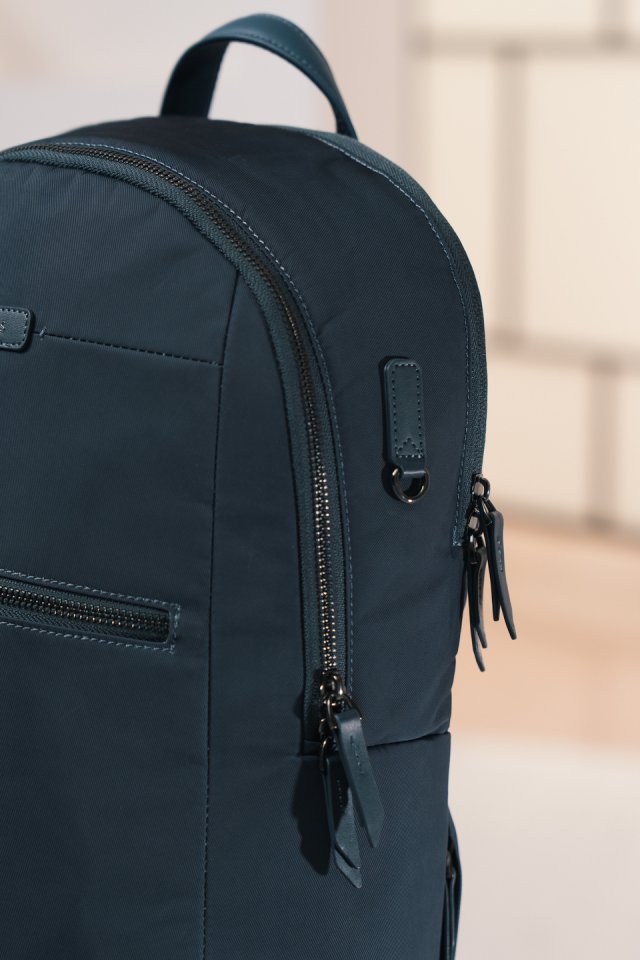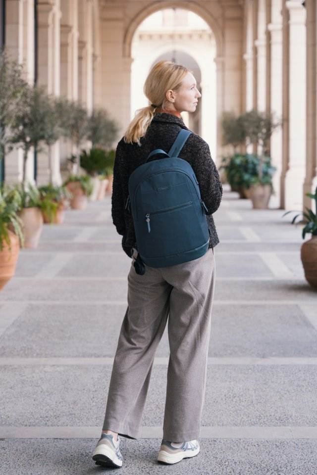 Repun ulkopinta on valmistettu vedenkestävästä memory-kankaasta, joka suojaa tavaroitasi sääolosuhteilta. Keinonahkaiset yksityiskohdat ja laadukkaat metalliosat lisäävät kestävyyttä ja hienostunutta ulkonäköä. Kirkas sisävuori helpottaa tavaroiden löytämistä, ja repun voi helposti kiinnittää matkalaukun vetoketjuun, mikä tekee matkasta sujuvampaa. Ympäristöystävällisesti valmistettu EcoSmart®-materiaaleista, jotka sisältävät 14 kierrätyspulloa, tämä reppu on hyvä valinta ympäristötietoiselle käyttäjälle.