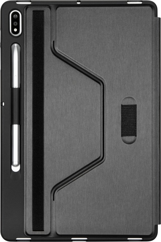 Targus Click-in -suojakotelo Samsung Tab S9+, S9 FE+, S8+, S7+ ja S7 FE malleille. Siinä on iskuja vaimentava alusta, joka kiinnittyy turvallisesti tabletin ympärille suojaten sen etu- ja takaosaa ja sivuja kolhuilta, putoamisilta ja naarmuilta. Suojakotelolle on myönnetty MIL-STD 810G iskusuojaus, eli se suojaa jopa 1,2 metrin pudotukselta. Patentoitu alusta varmistaa pääsyn kaikkiin tabletin portteihin ja kameraan. Etukannessa on automaattinen käynnistys/lepotilatoiminto ja pehmeä sisäpuoli, joka suojaa näyttöä ja muuntuu telineeksi. Targuksen tablet-koteloilla on rajoitettu elinikäinen vaihtotakuu