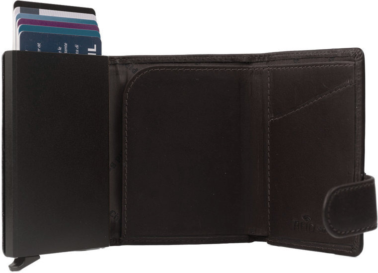 Kun vedät korttikotelon alaosassa olevaa pientä vipua itseäsi kohti, kortit tulevat ulos korttitelineestä viuhkamaisena. Näin saat heti selkeän yleiskuvan korteistasi, eikä sinun tarvitse etsiä oikeaa korttia. Korttiteline sopii 7 litteälle kortille tai 4 paksulle kortille, kuten luottokorteille.
