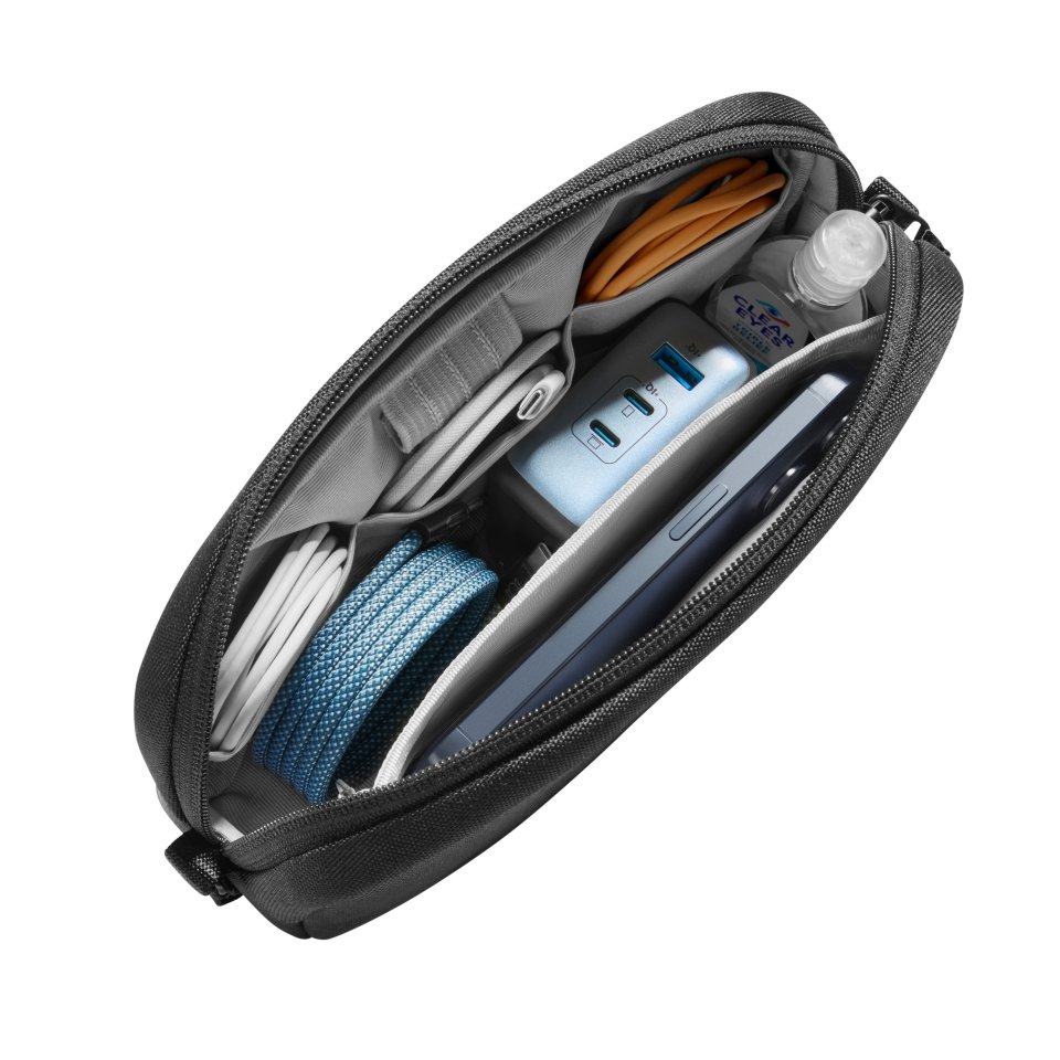 Pussin sisällä on joustavia lokeroita ja taskuja, jotka pitävät tarvikkeet siististi paikoillaan. Voit säilyttää esimerkiksi latauskaapeleita, virtalähteitä, kuulokkeita, muistikortteja, USB-tikkuja, pientä hiirtä tai jopa kannettavan SSD-levyn. Vetoketjullinen tasku tarjoaa lisäturvaa arvokkaammille tarvikkeille, kuten adaptereille tai varavirtalähteelle.