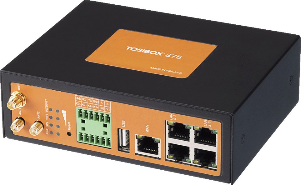 TOSIBOX® 375 on kompakti ja monipuolinen ratkaisu, joka sopii mihin tahansa teollisuuteen. Kiinteän Ethernet-liitännän, WiFin tai sisäisen LTE-moduulin avulla voit nauttia vakaasta etäkäytöstä missä tahansa maailmassa. Ei tarvita teknistä asiantuntemusta – vain liitä ja käytä!