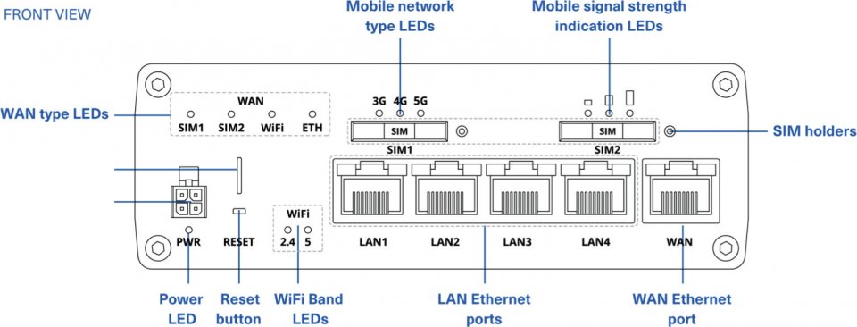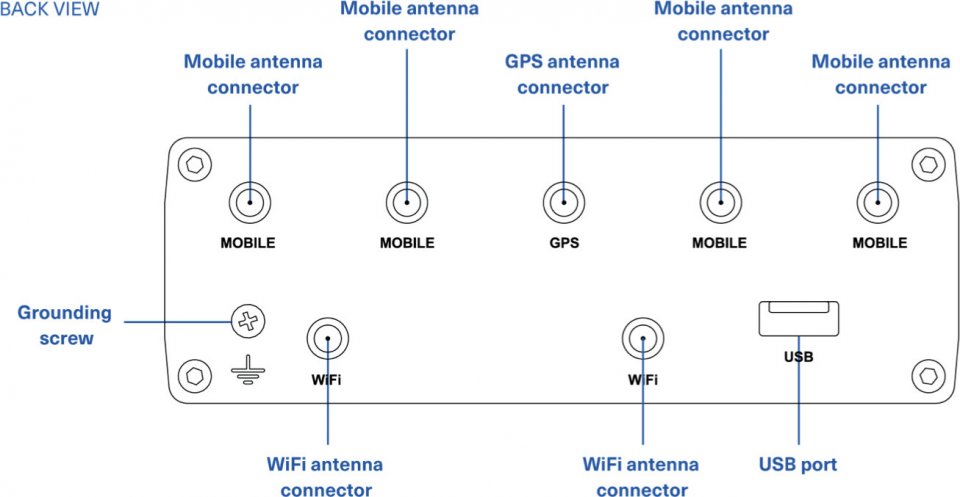 • Litännät: 9-50V DC, 2 x WiFi-antenniliitäntä, RP-SMA, 2 x 5G/LTE-antenniliitäntä, SMA Female, 1 x GNSS, Kiinnitys DIN-kiskoon (takana), 9-50V DC (maksimi virrankulutus 18W)