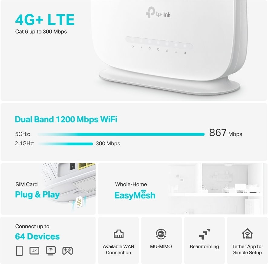 Helppo käyttöönotto. Laita SIM-kortti laitteeseen ja käynnistä se. Tämän jälkeen yhdistä laitteet langattomaan verkkoon. Salasanan löydät laitteen takana olevasta tarrasta. Nettiyhteys on valmis! Vaihtoehtoisesti voit kytkeä ethernet-kaapelin tietokoneen ja reitittimen välille. Hallinta on helppoa TP-LInk Tether -ohjelmalla ( Android ja IOS).