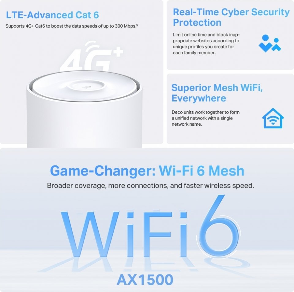 Deco 4G-X10 on koko kodin Wi-Fi-ratkaisu, joka pitää verkkosi vahvana kotisi koosta ja rakenteista huolimatta. Deco 4G-X10 WiFi 6 -Mesh-järjestelmä tukee jopa 120 yhtä aikaista käyttäjää. Verkon laajentaminen on helppoa Deco -reitittimillä. Järjestelmä käyttää yhtä verkon nimeä ja vaihtaa yhteyttä tukiasemien välillä saumattomasti. Suunniteltu takaamaan jatkuva internetyhteys. Toimii kaikkien operaattorien SIM-korteilla.