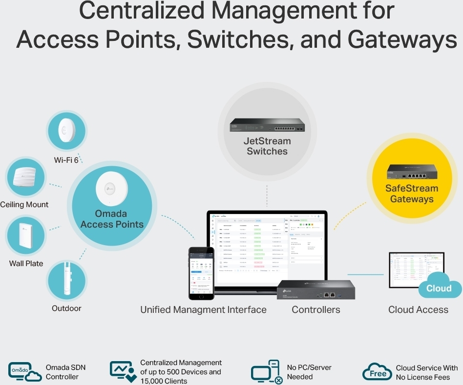 • Jopa 500 JetStream kytkimelle, reitittimelle ja Omada tukiasemalle