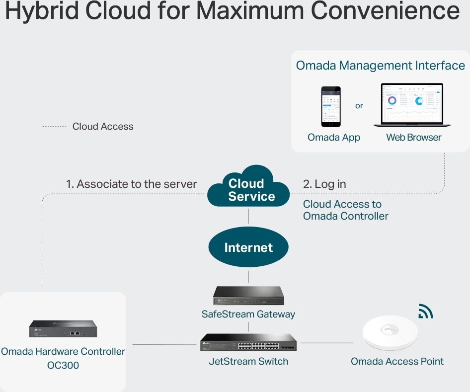 Etähallintalaite JetStream kytkimille, reitittimille ja Omada tukiasemille.
