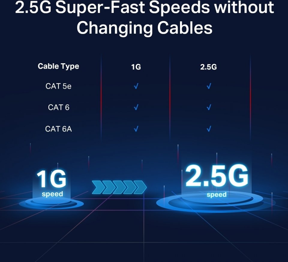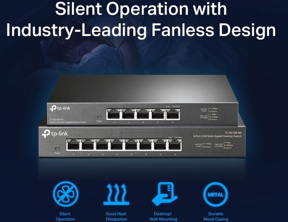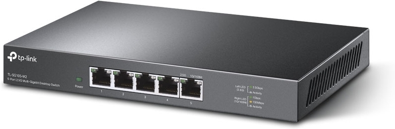 TP-Link TL-GS105-M2 on 5-porttinen 2.5 Gigabitin ethernet kytkin jossa viisi 100 Mbps/ 1 Gbps/ 2.5 Gbps Auto MDI/MDIX RJ-45 porttia. Tällä kytkimellä päivität kodin tai toimiston verkon nopeaan Multi-Gigabit aikaan.