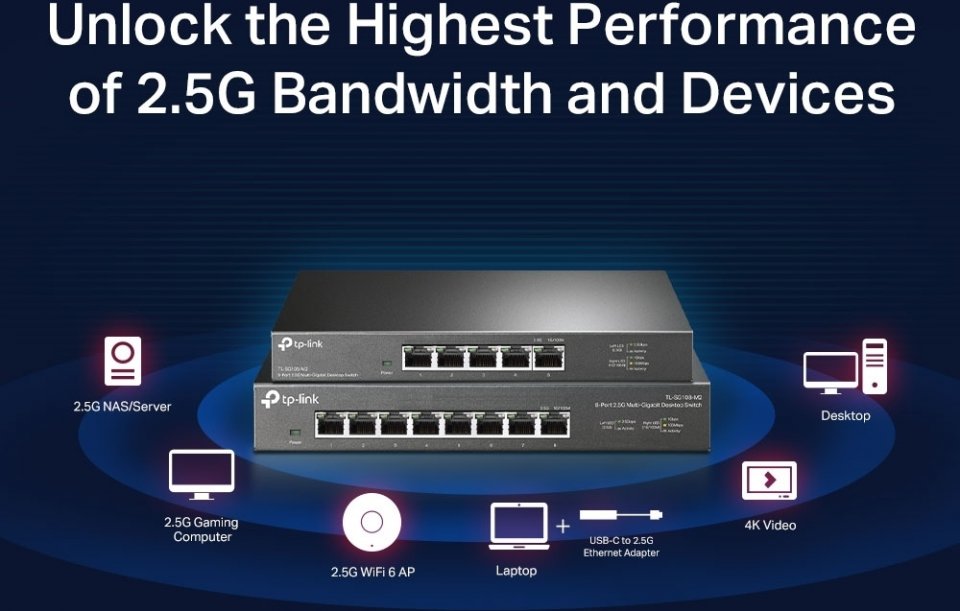 TP-Link TL-SG108-M2 on 8-porttinen 2.5 Gigabitin ethernet kytkin jossa kahdeksan 100 Mbps/ 1 Gbps/ 2.5 Gbps Auto MDI/MDIX RJ-45 porttia. Tällä kytkimellä päivität kodin tai toimiston verkon nopeaan Multi-Gigabit aikaan.