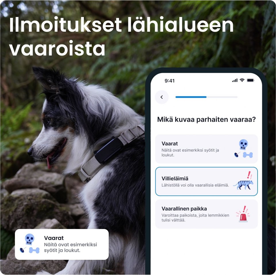 Voit tehdä ilmoituksen lähialueen vaaroista, kuten myrkyistä, vaaranpaikoista tai villieläimistä, Tractive GPS -sovelluksen kartalla. Saat hälytyksen, jos lemmikkisi menee liian lähelle muiden Tractive GPS -lemmikkipaikantimen käyttäjien ilmoittamia vaaroja.