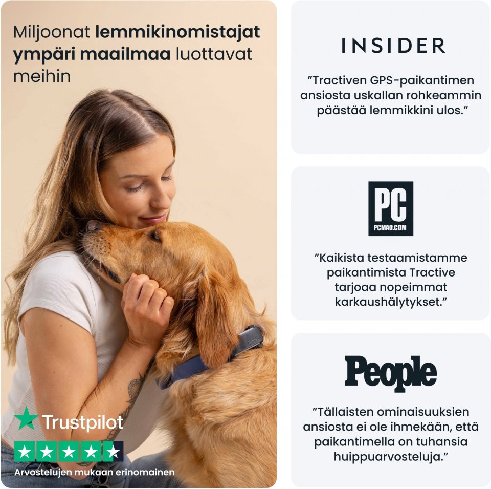 Näet koirasi sijainnin reaaliaikaisesti, jos se karkaa. Tractive GPS -koirapaikantimella voit muun muassa seurata koiraasi ja tutkia sen sijaintihistoriaa.