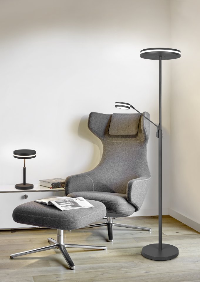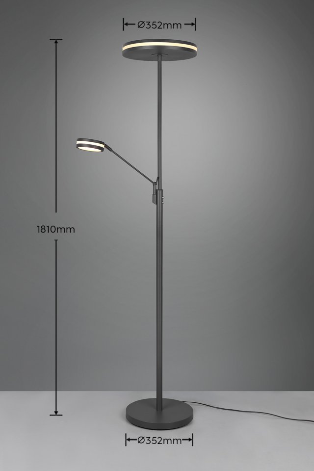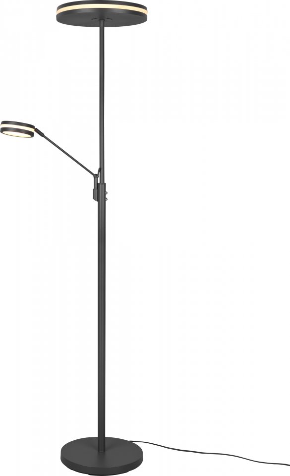 Elegantti, kaksiosainen Trio Franklin LED Upperlight -lattiavalaisin hurmaa modernilla tyylillään. Selkeälinjainen valaisin on tyylikäs näky, mutta myös tehokas ja käytännöllinen valaisija. Valon tasaisuuden ansiosta kirkaskaan valo ei häikäise. Valaisimen rungon sivussa on kätevä lukuvalo, joka on suunnattavissa vartta säätämällä. Pyöreä, rungon päässä oleva valonlähde luo tunnelmallista, joka suuntaan heijastuvaa valoa. Valaisimen runko on metallia ja valonlähteenä toimivat integroidut LED:it, 35 W ja 6,5 W. Valon värilämpötilaa on mahdollista säätää kolmen vaihtoehdon välillä (2700, 3200, 4000 K) rungossa olevasta kytkimestä. Molempien valojen kirkkaus on säädettävissä erillisten kosketuskytkimien kautta. Sillä valaisimessa on muistitoiminto, muistaa se aiemmin käytössä olleet asetukset ja ne ovat käytössä, kun valaisin seuraavan kerran kytketään päälle. Korkeus on 181 cm ja suuren valonlähteen halkaisija on 35,2 cm.