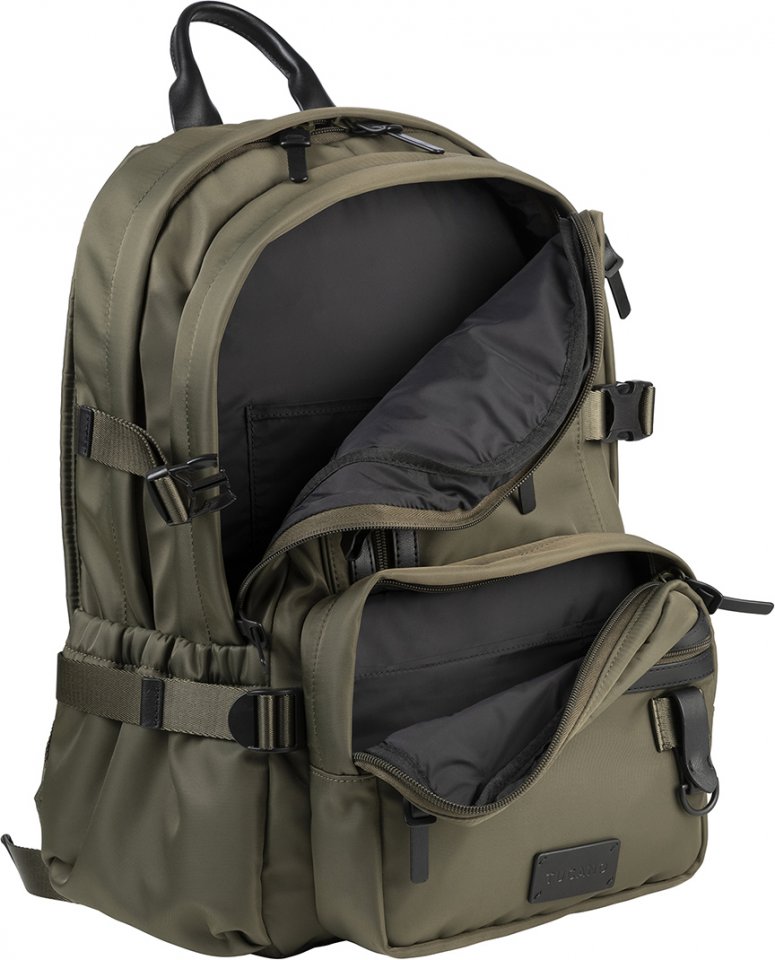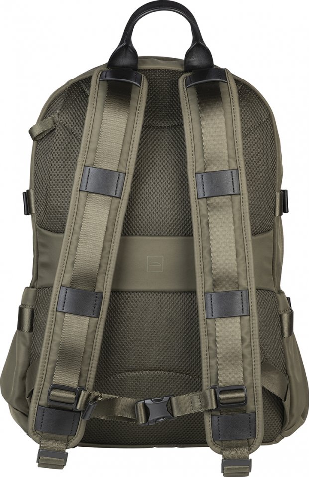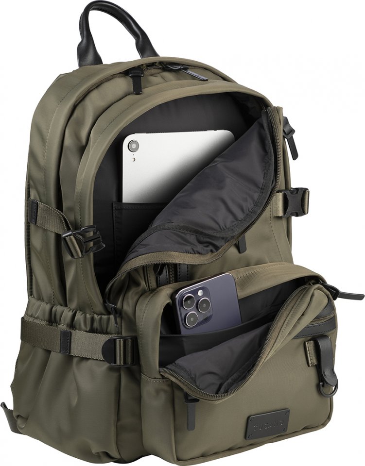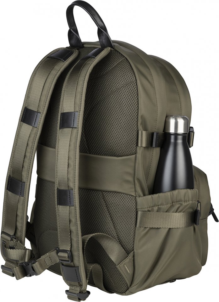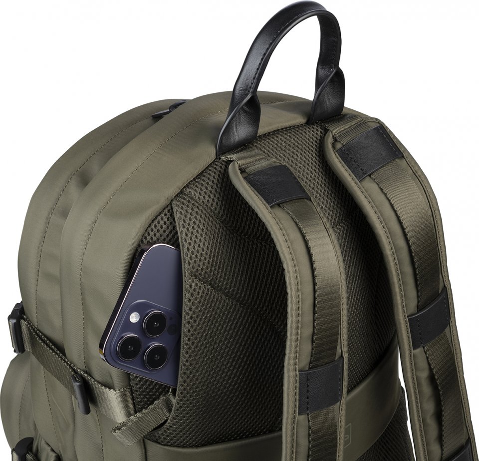 Kierrätetystä nylonista valmistettu reppu, jossa on tyylikkäät nahkaiset yksityiskohdat. Repussa on tilava keskilokero, jossa on pehmustettu suojatasku 15,6″ kannettaville tietokoneille, jopa 16″ MacBookeille ja tabletille. Pehmustettu lokero on erotettu vetoketjuilla ja tarjoaa runsaasti ja hyvin järjestettyjä tiloja. Etupaneelissa on kaksi tilavaa taskua ja repussa on erinomainen sisäinen organisointi. Ergonomisesta selkäosiosta löytyy vetoketjullinen turvatasku sekä hihna jolla saat repun kiinni matkalaukun vetoaisaan.