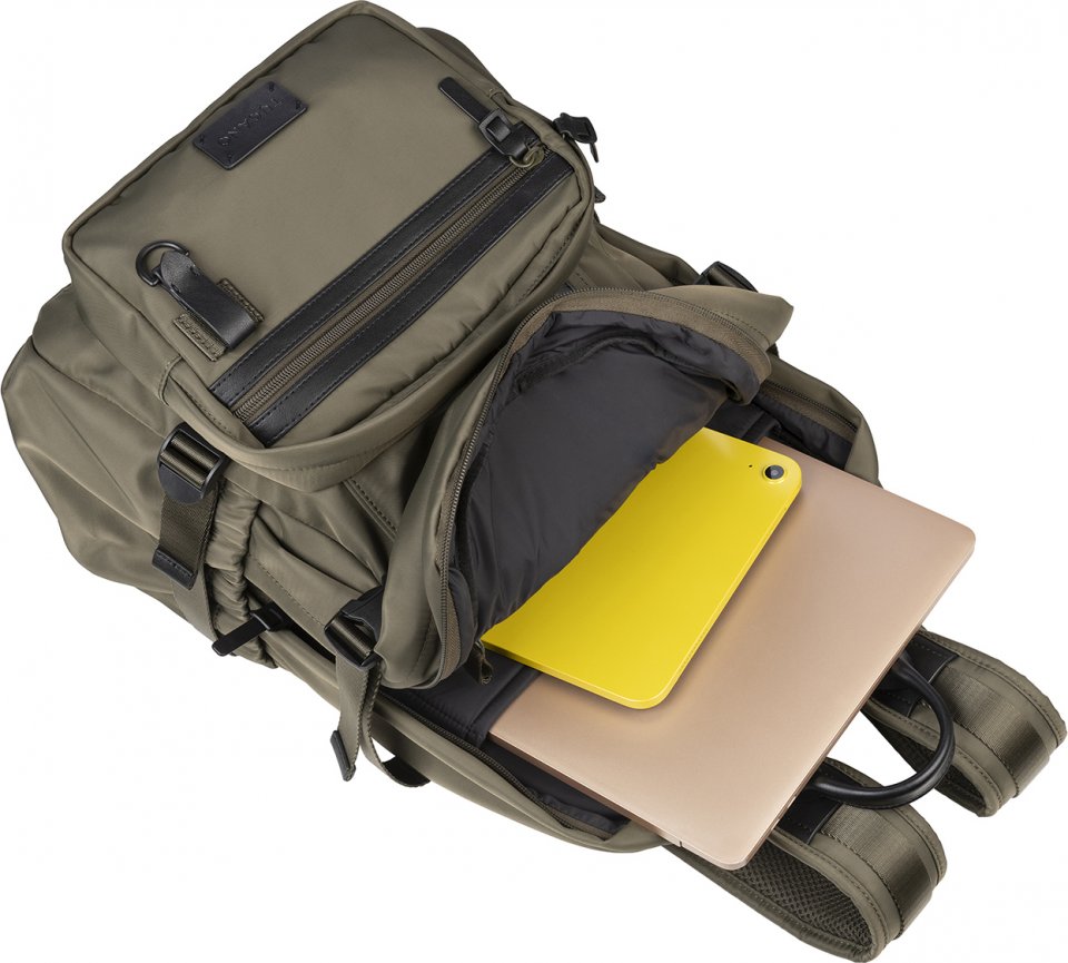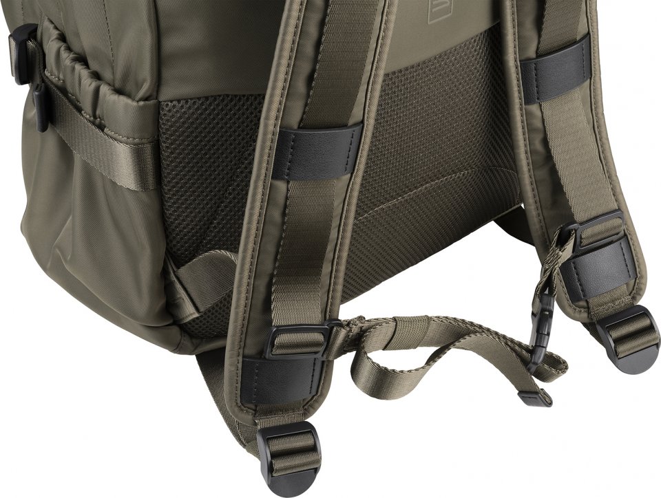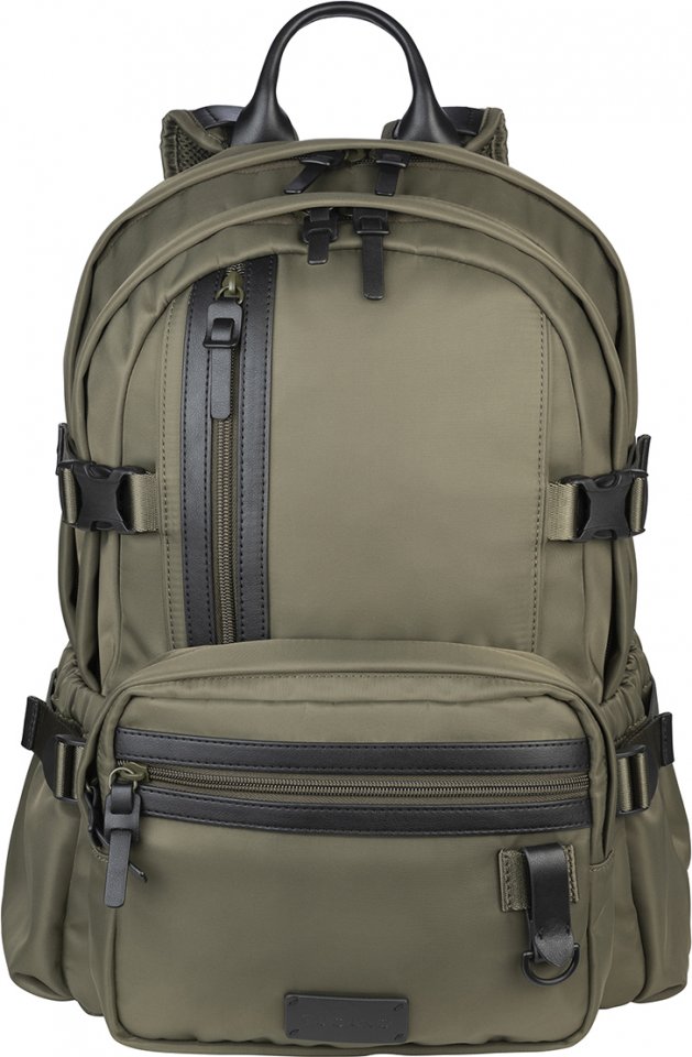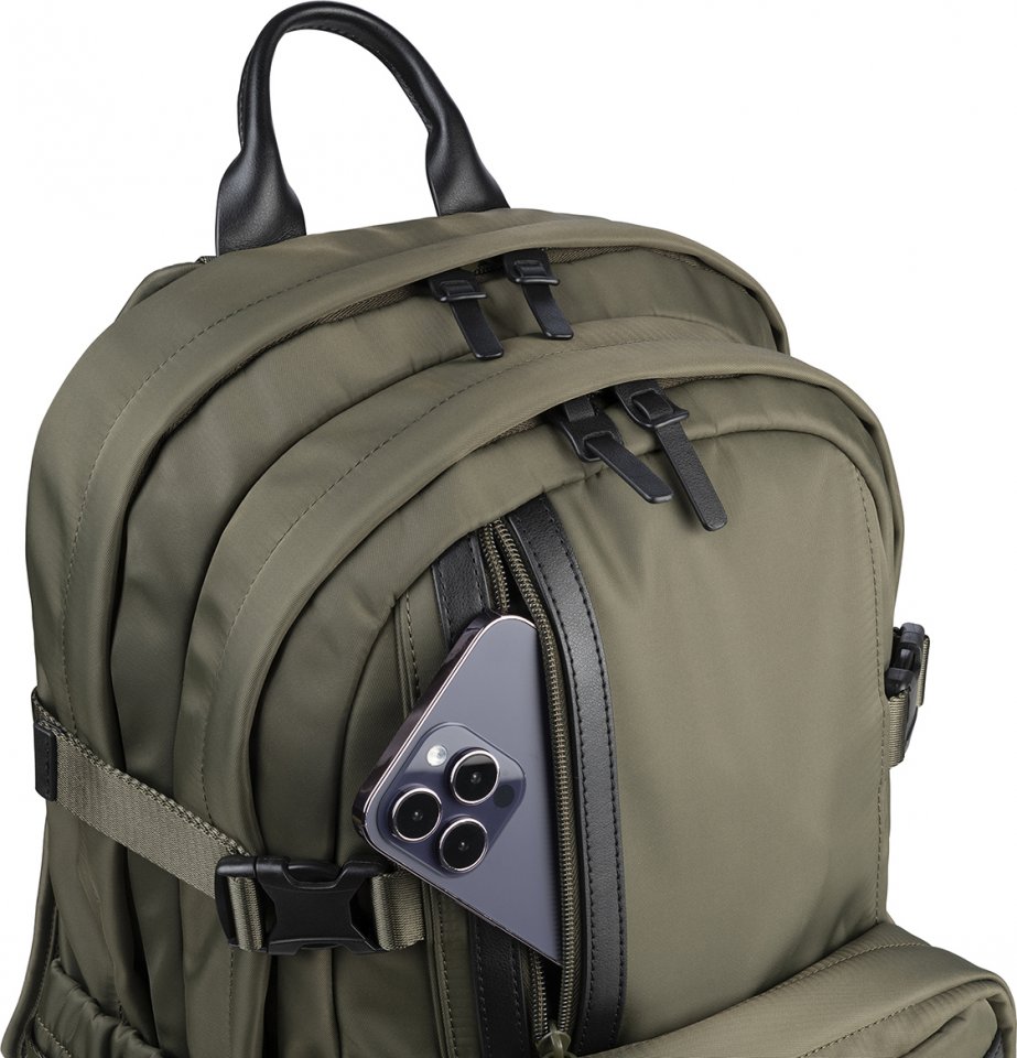 Kierrätetystä nylonista valmistettu reppu, jossa on tyylikkäät nahkaiset yksityiskohdat. Repussa on tilava keskilokero, jossa on pehmustettu suojatasku 15,6″ kannettaville tietokoneille, jopa 16″ MacBookeille ja tabletille. Pehmustettu lokero on erotettu vetoketjuilla ja tarjoaa runsaasti ja hyvin järjestettyjä tiloja. Etupaneelissa on kaksi tilavaa taskua ja repussa on erinomainen sisäinen organisointi. Ergonomisesta selkäosiosta löytyy vetoketjullinen turvatasku sekä hihna jolla saat repun kiinni matkalaukun vetoaisaan.