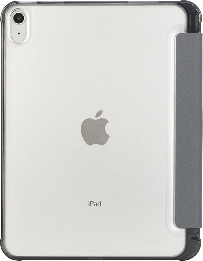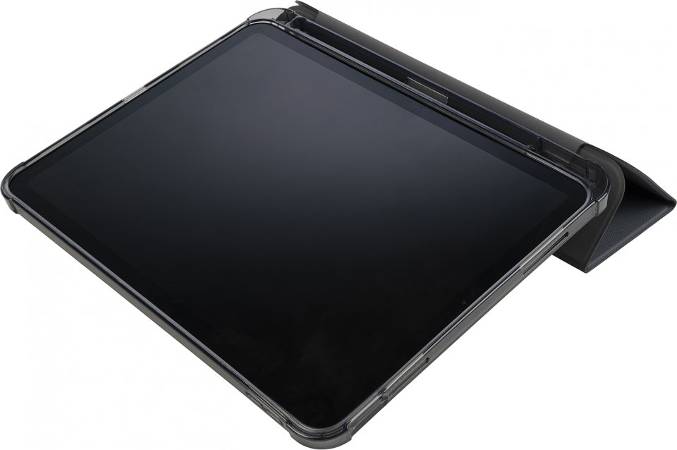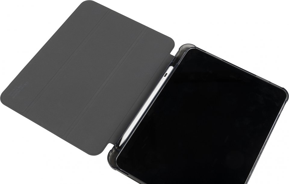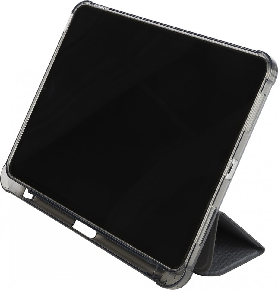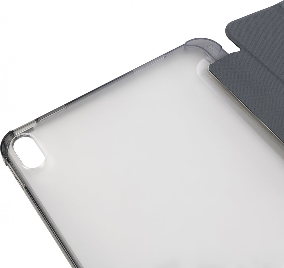 Osittain kierrätetystä muovista valmistettu suojakotelo 10,9-tuumaiselle Apple iPad -tabletille. Etukansi on valmistettu satiiniefektillä varustetusta materiaalista ja muuntuu käteväksi telineeksi. Läpinäkyvä ja iskunkestävä takakuori on valmistettu kaksinkertaisesti ruiskuvaletusta polykarbonaatista, ja siinä on TPU-reunus, joka helpottaa iPadin asettamista koteloon. Lisäksi kotelo sisältää sisäisen lokeron Apple Pencilille.