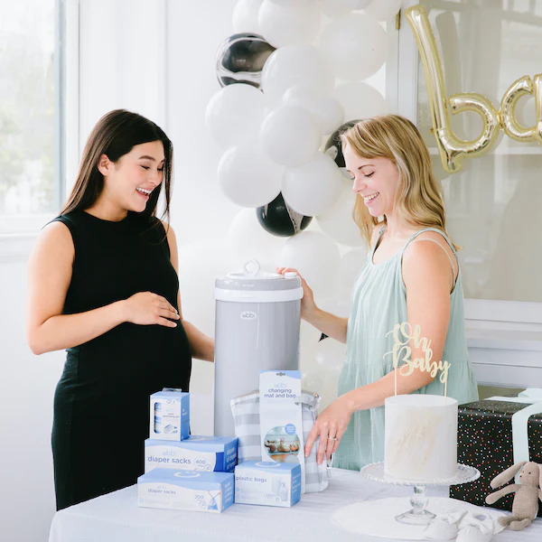 Lahjapakkaus sisältää vaipparoskiksen, 25 yhteensopivaa muovipussia, vaippasäkkejä, tuoksugeeliä, hoitolustan ja siihen sopivan säilytyspussin.