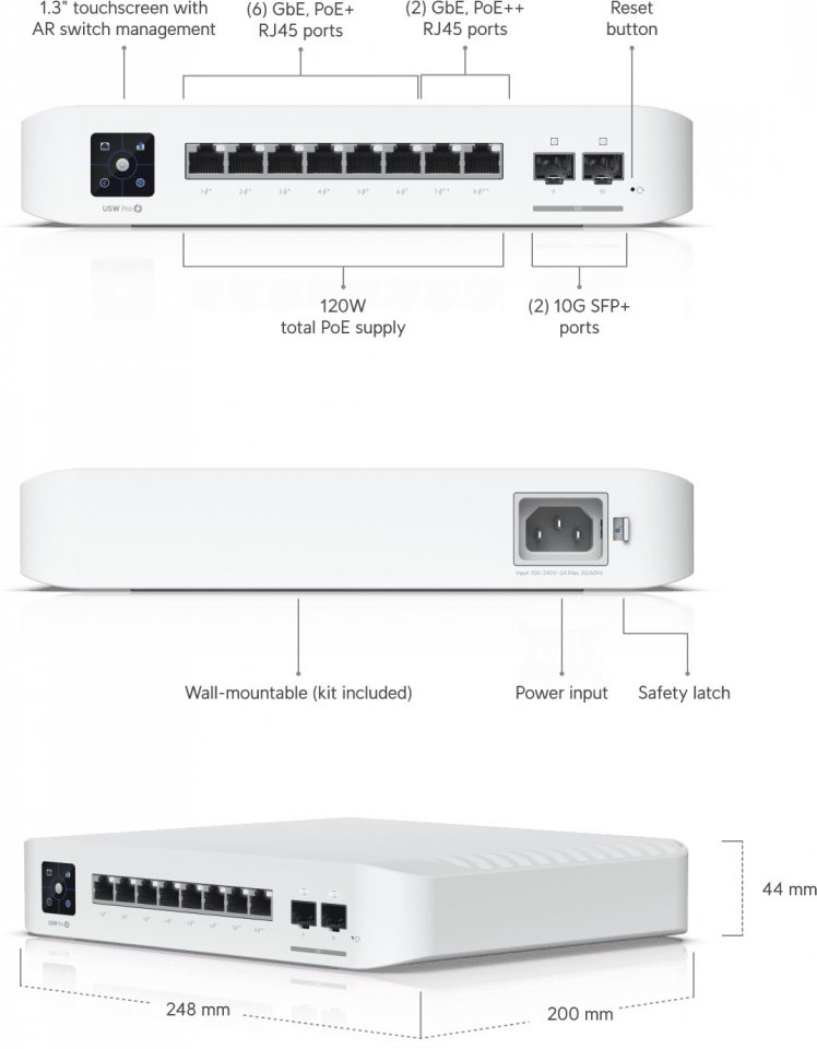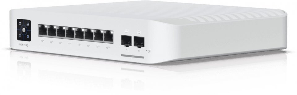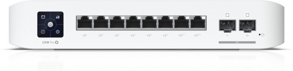 USW-Pro-8-POE on hallittava Layer 3 10 Gigabit PoE++ kytkin, jossa on kuusi Gigabit PoE+ porttia, kaksi Gigabit PoE++ porttia sekä kaksi 10 SFP+ porttia.