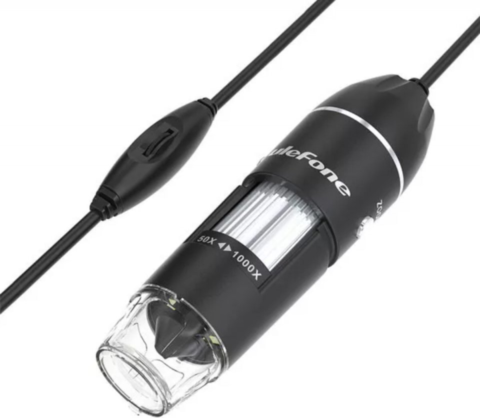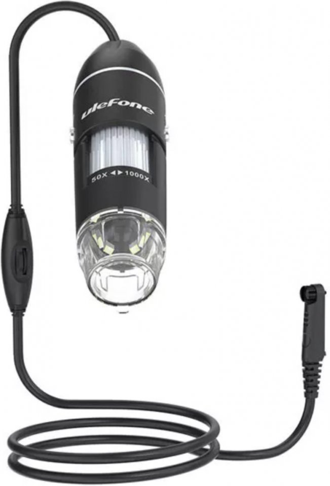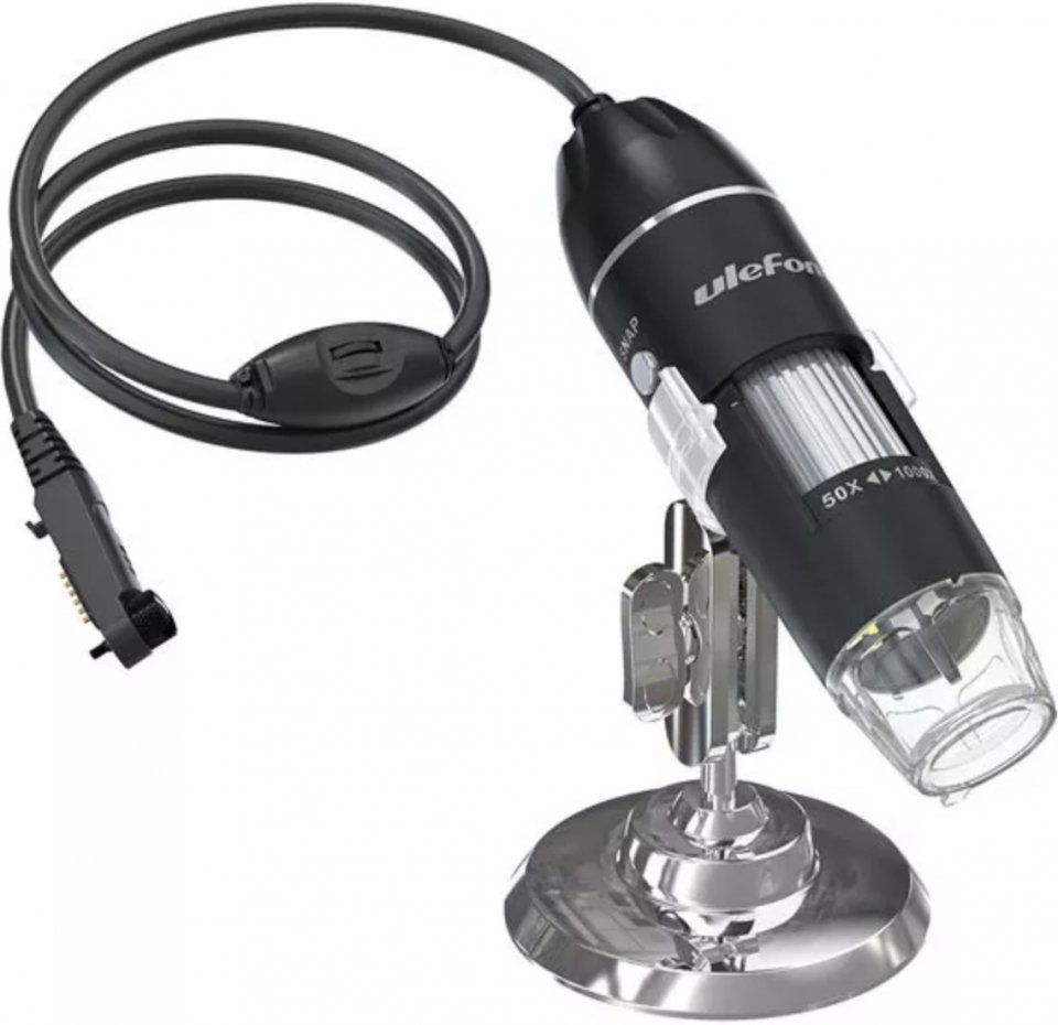 Mikroskoopissa on laadukas 50-1000 -kertainen 1MP HD -suurennos, eli voit esimerkiksi katsella, kuvata, ja videoida mehiläisen siipiä ja lehtien suonia uskomattomalla tarkkuudella. Se sopii mainiosti myös työvälineeksi elektroniikan, korujen ja kellojen korjaukseen. Kahdeksan himmennettävää LED-valoa ovat helposti säädettävissä kaapelissa sijaitsevalla pyöritettävällä rullalla, joten tarkastelu onnistuu huonommassakin valaistuksessa. Kätevien pikanäppäimien avulla kuvaa voi suurentaa ja otoksen voi napata vain yhdellä napinpainalluksella. Mikroskooppi voidaan helposti liittää uSmart-liitännän kautta Ulefone Power Armor puhelimeen.