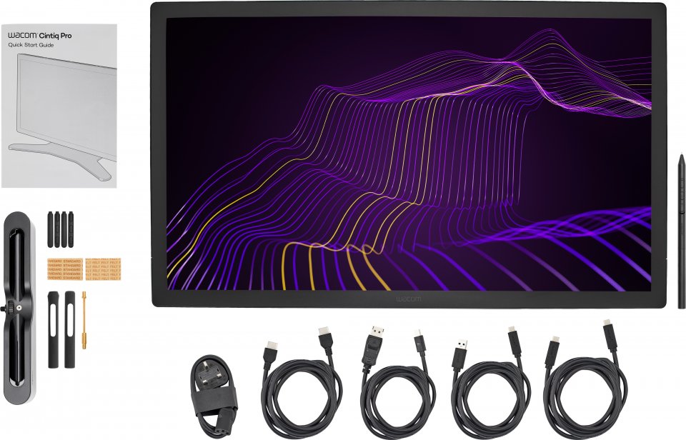 • Pakkauksen sisältö: Wacom Cintiq Pro 27 + jalusta, Wacom Pro Pen 3, irroitettava kynäpidike + 10 vaihtokärkeä, USB-C-kaapeli (1,8 metriä), USB-C - USB-A -kaapeli (1,8 metriä), HDMI-kaapeli (1,8 metriä), mini DisplayPort - DisplayPort -kaapeli, virtalähde, virtajohto (1,0 metriä), pikaopas