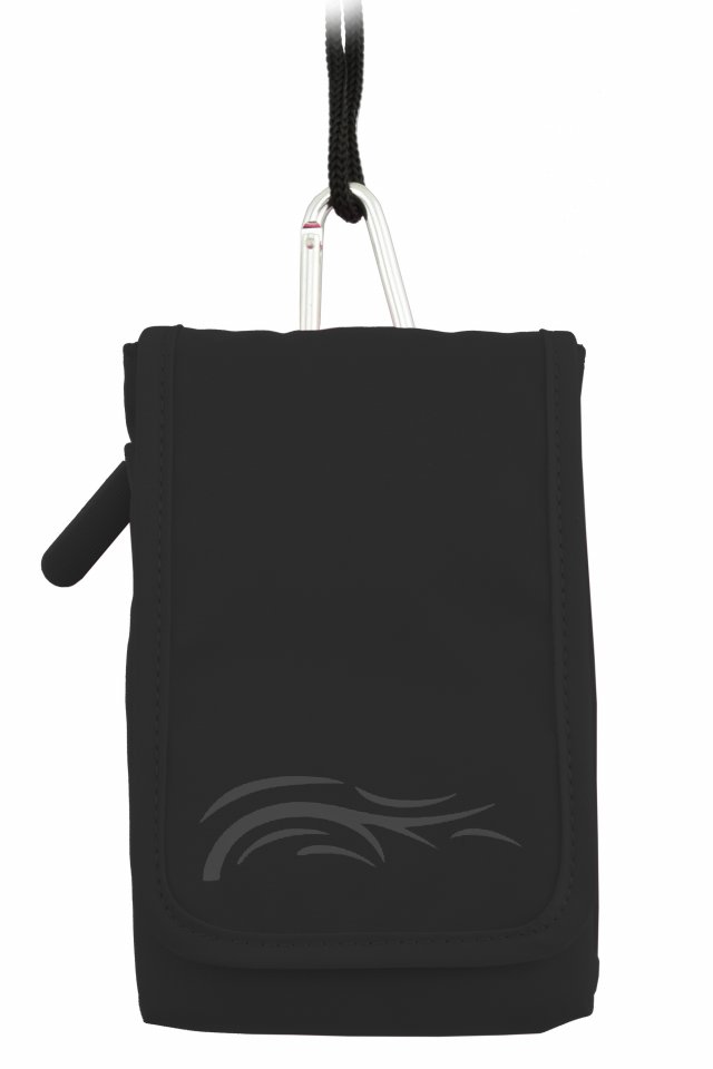 Yleismallin puhelinpussi, mukana musta kaulahihna ja karabiinilenkki. Takana vetoketjutasku ja vyölenkki. Pussin sisämitat 133 x 80 x 10 mm.