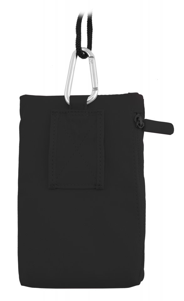Yleismallin puhelinpussi, mukana musta kaulahihna ja karabiinilenkki. Takana vetoketjutasku ja vyölenkki. Pussin sisämitat 153 x 95 x 15 mm.