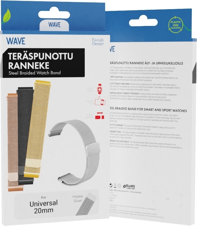 Wave teräspunottu ranneke on muodikas vaihtoranneke äly- ja urheilukelloille. Ranneke sopii ajattoman tyylinsä puolesta niin arkeen kuin juhlaan ja kestää laadukkaiden materiaaliensa ansiosta loistavasti kovempaakin käyttöä.