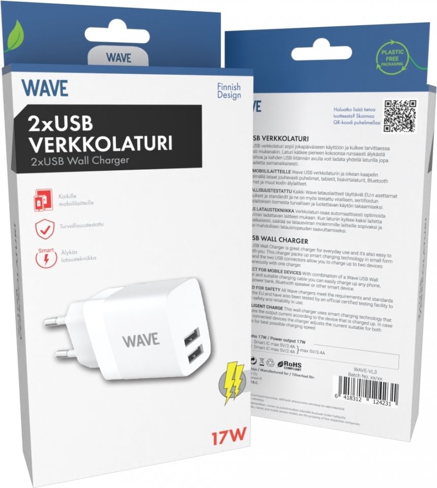 Wave USB verkkolaturi sopii jokapäiväiseen käyttöön ja kulkee tarvittaessa kätevästi mukanakin. Laturi kätkee pieneen kokoonsa runsaasti älykästä lataustehoa ja kahden USB-liitännän avulla voit ladata yhdellä laturilla jopa kahta laitetta samanaikaisesti.