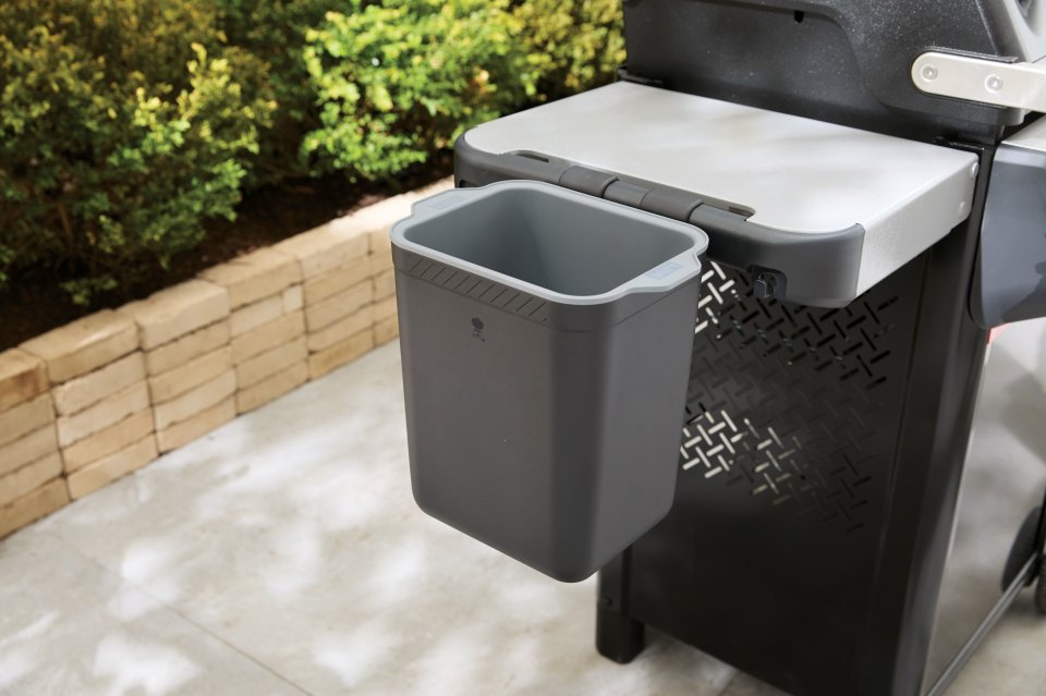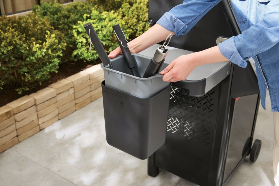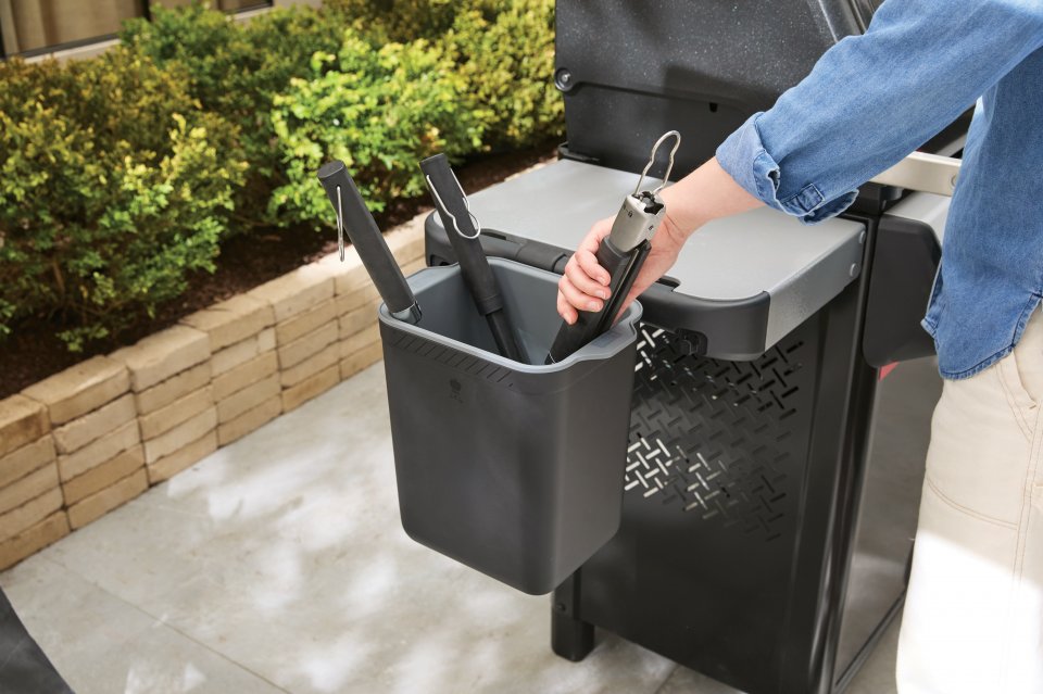 Tarviketeline napsahtaa helposti kiinni sivukiskoon, joten sen asentaminen ja irrottaminen on nopeaa ja vaivatonta. Tämä tekee siitä käytännöllisen lisävarusteen grillauksen aikana, kun tarvikkeet halutaan pitää nopeasti saatavilla.