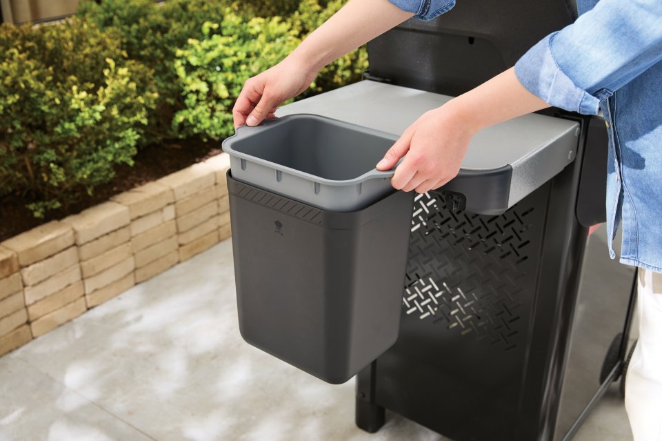 Telineessä on irrotettava sisäosa, joka kerää siihen mahdollisesti valuvat kastikkeet ja öljyt, estäen grillin sivutason likaantumisen. Sisäosan voi helposti irrottaa ja kantaa sisälle puhdistettavaksi, mikä helpottaa ylläpitoa ja pidentää telineen käyttöikää.
