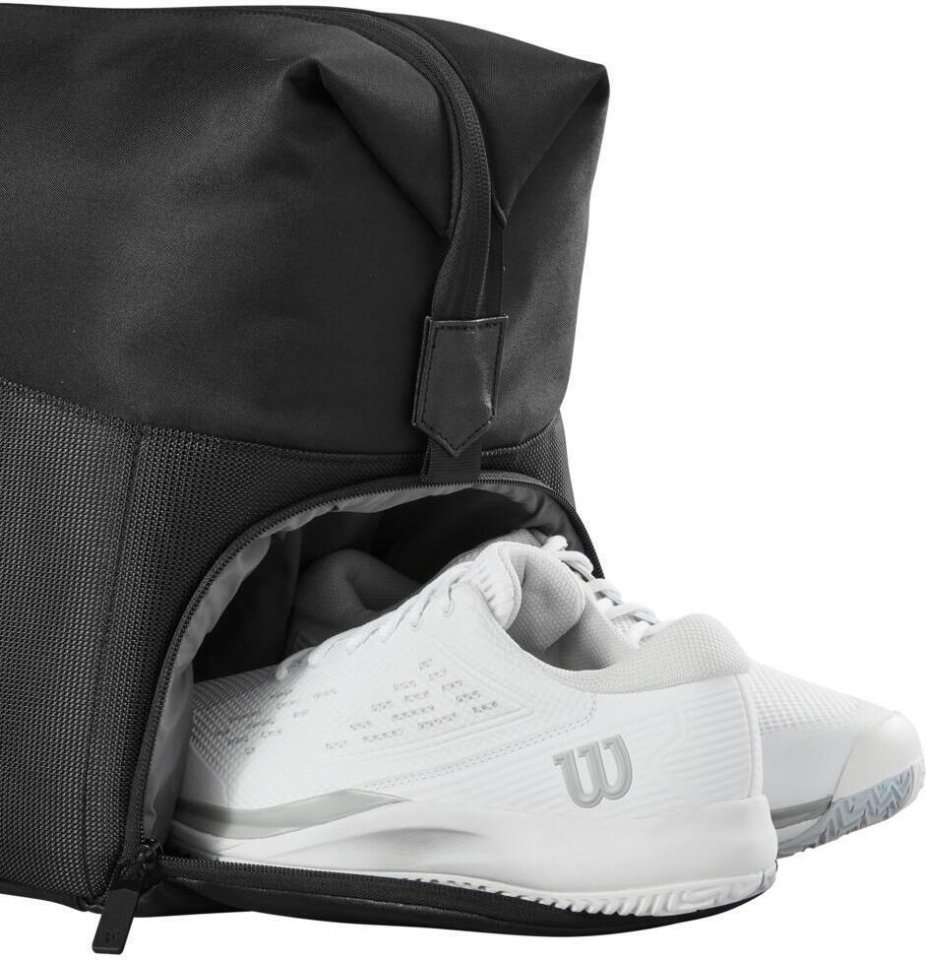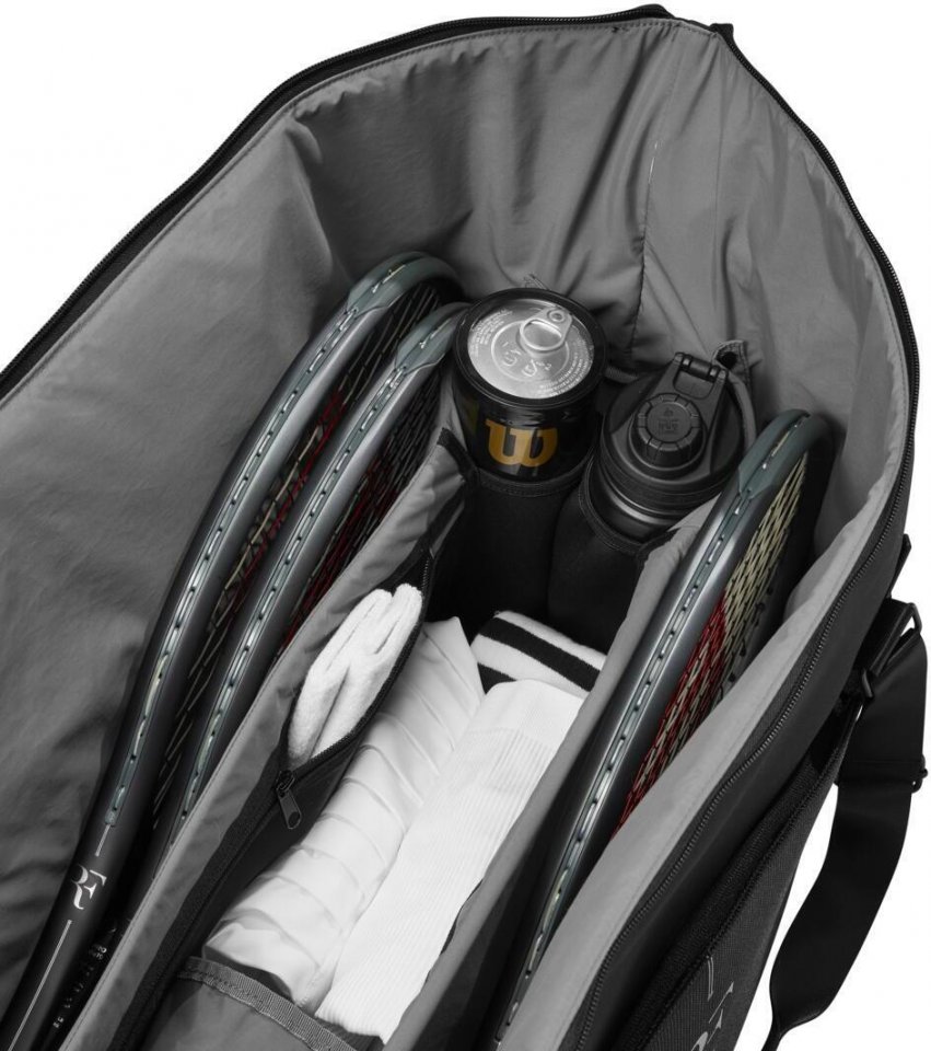 Wilson Roger Federer -malliston tyylikkään musta laukku sopii niin tenniskentälle kuin viikonloppureissun kassiksi. Laukussa on tilaa jopa kuudelle mailalle sekä muille varusteille. Kengille laukun päädyssä on oma lokeronsa, joten ne eivät likaa laukussa olevia vaatteitasi. SIvussa olevaan pieneen taskuun saat puhelimen, lompakon ja muut pienet esineet. Tyylikkään mustassa laukussa on ikoninen RF-logo painettuna kylkeen sekä tyylikkäänä yksityiskohtana vetoketjun vetimissä.