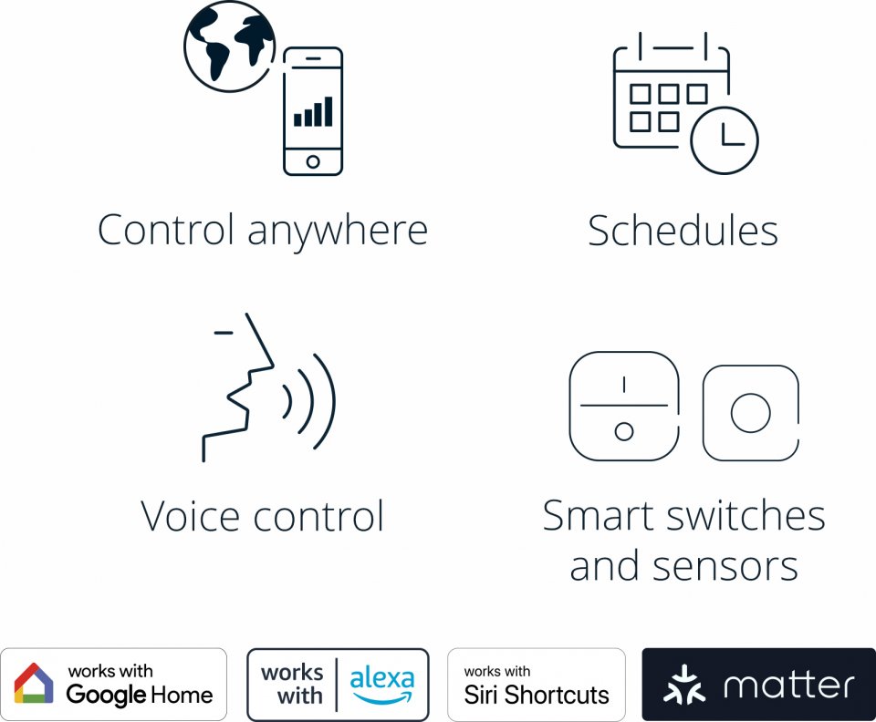 Tämä tuote on Matter-sertifioitu. Voit ottaa tuotteen käyttöön ja ohjata sitä haluamallasi älykotialustalla sekä saada sen toimimaan saumattomasti muiden Matter-sertifioitujen laitteiden kanssa. Tämä vesitiivis ja säänkestävä valaisin on suunniteltu käytettäväksi ulkotiloissa. Se on valmistettu UV-säteilyä, tuulta ja lunta kestävistä materiaaleista. Valaisimen kestävyys on testattu erilaisissa sääolosuhteissa.