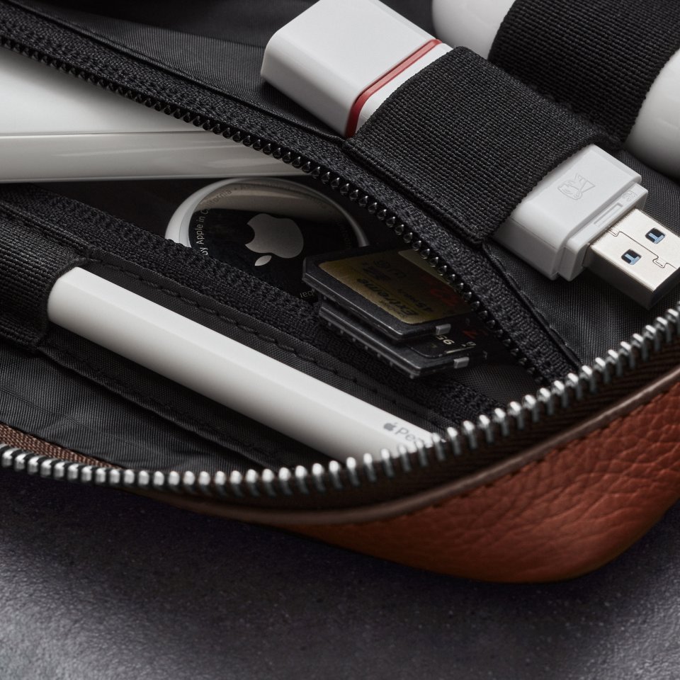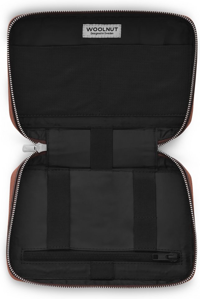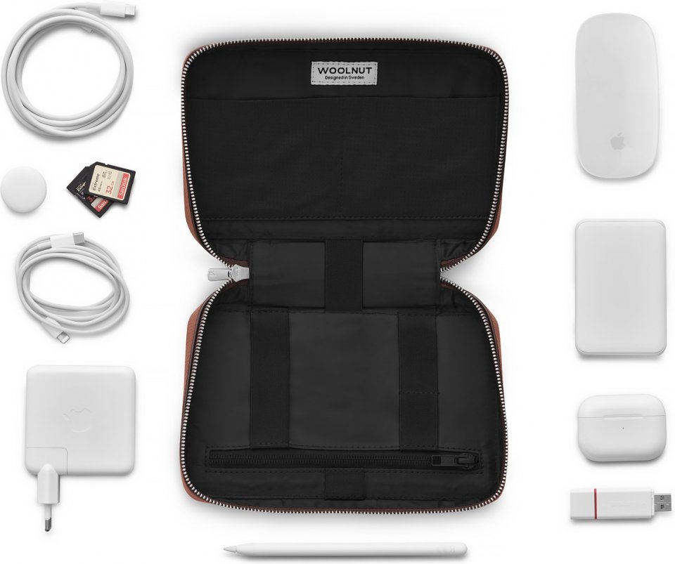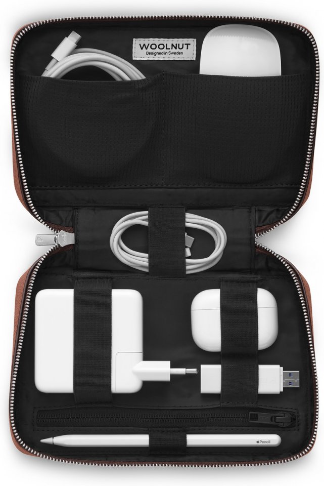 Tämä nahkainen tarvikelaukku pitää päivittäiset tekniset tarvikkeet siististi järjestyksessä, yhdessä paikassa. Woolnut Leather Tech Organizer on suunniteltu kaikkien teknisten tarvikkeiden monipuoliseen säilyttämiseen latureista muistikortteihin. Se voidaan avata täysin avoimeksi, jolloin se on erittäin helppokäyttöinen. Monipuoliset taskut ja joustavat kiristynauhat on suunniteltu harkitusti. Tarvikkeesi kulkevat vaivattomasti mukana jokapäiväisessä käytössäsi, kuin myös pidemmilläkkin matkoilla. Ulkopuoli on valmistettu skandinaavista alkuperää olevasta full-grain nahasta ja sisäpuoli on vuorattu 100 % kierrätetyllä taftipolyesterilla (PET). Vetoketju on YKK:n EXCELLA, joka yksi maailman hienoimmista metallivetoketjuista, valmistettu Japanissa.